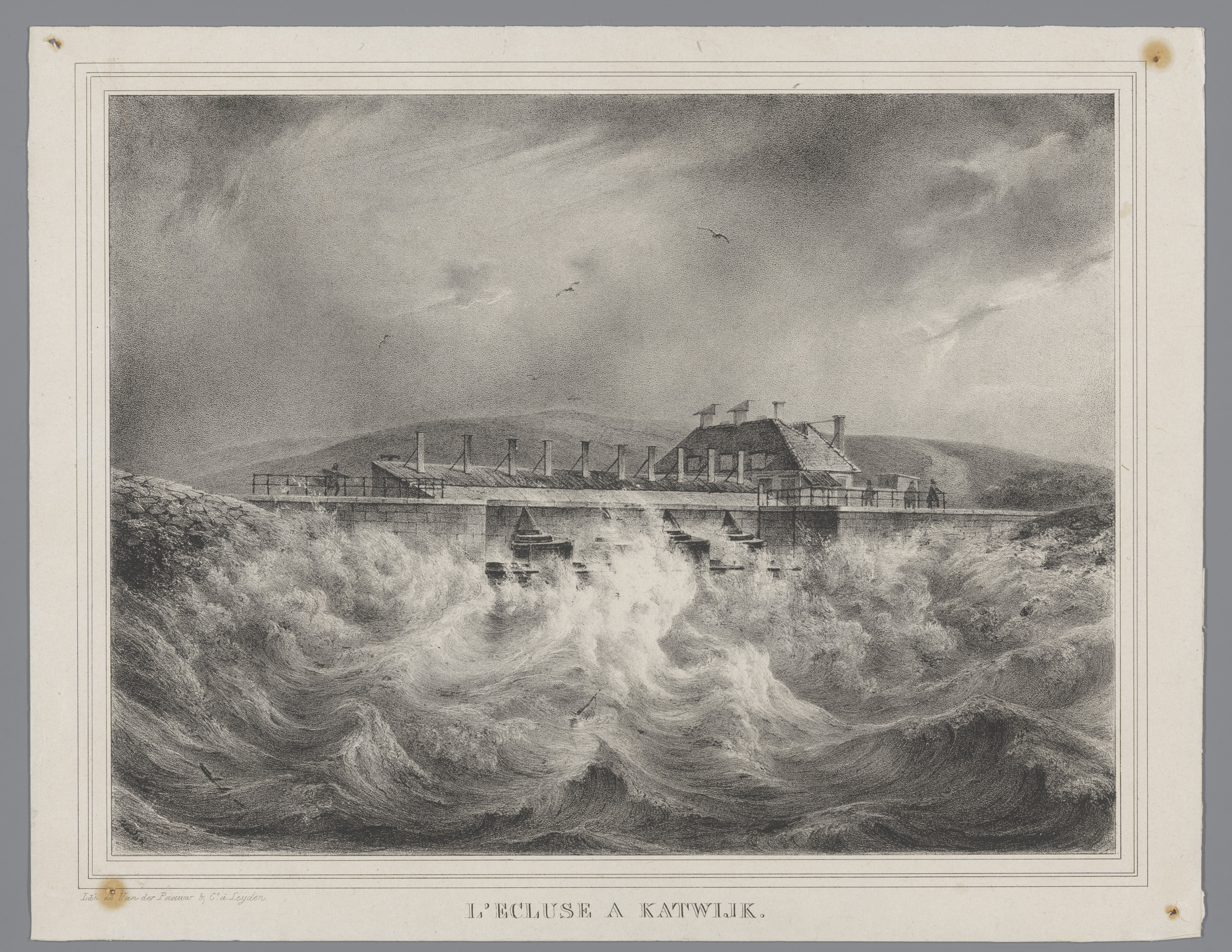 Gezicht op de sluis te Katwijk aan Zee tijdens storm