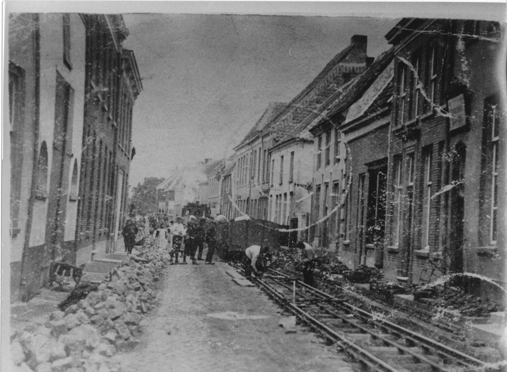 De aanleg van de trambaan in de Langestraat te Huiss...
