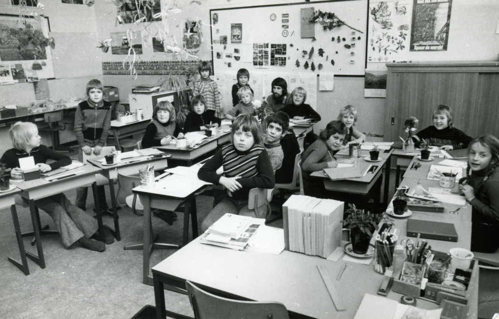 Zwart-wit foto van een klas in de nieuwe school te A...