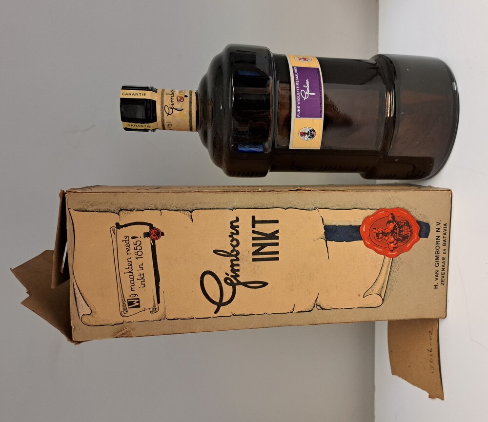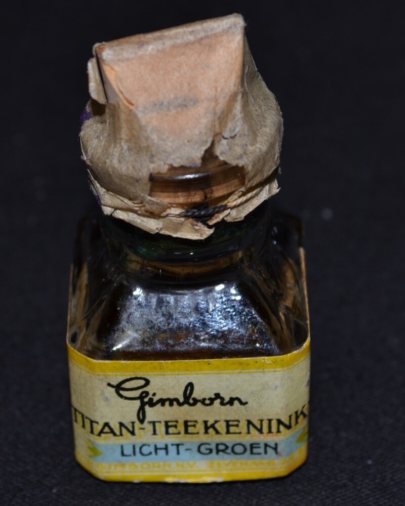 Flesjes van glas gevuld met 'Titan-teekeninkt' van H...