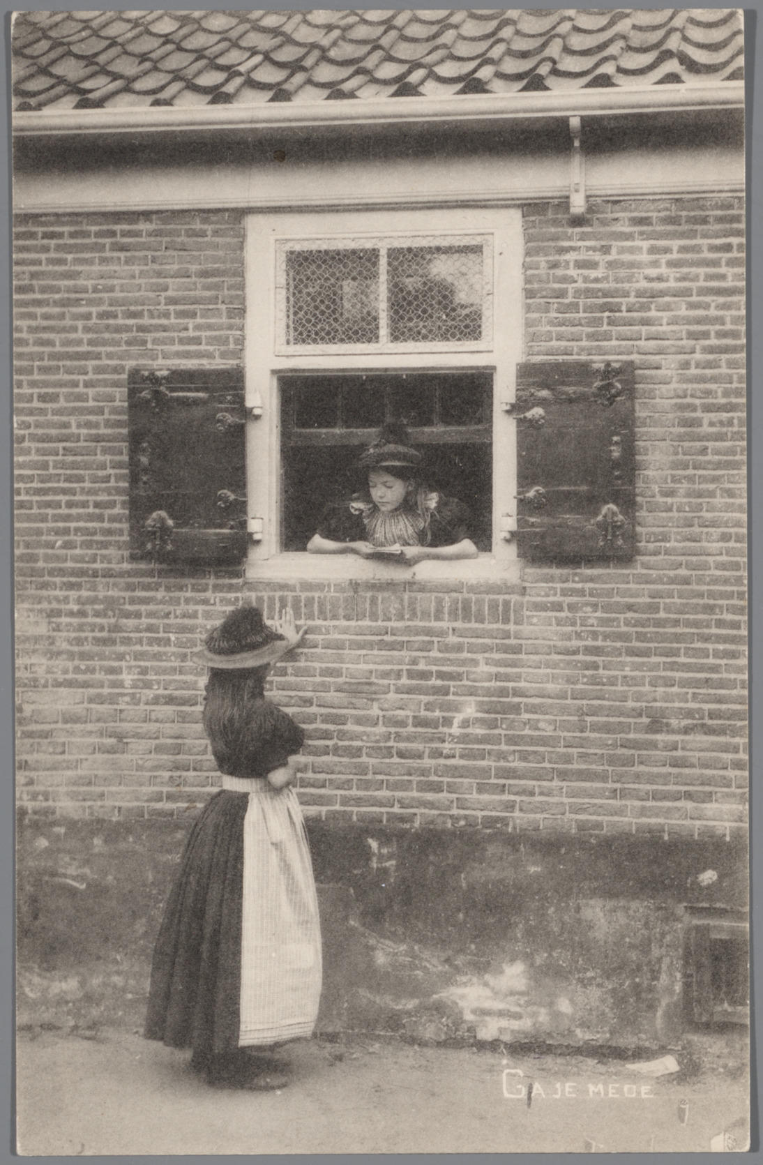 Groep meisjes in Walcherse dracht, spelende een krin...