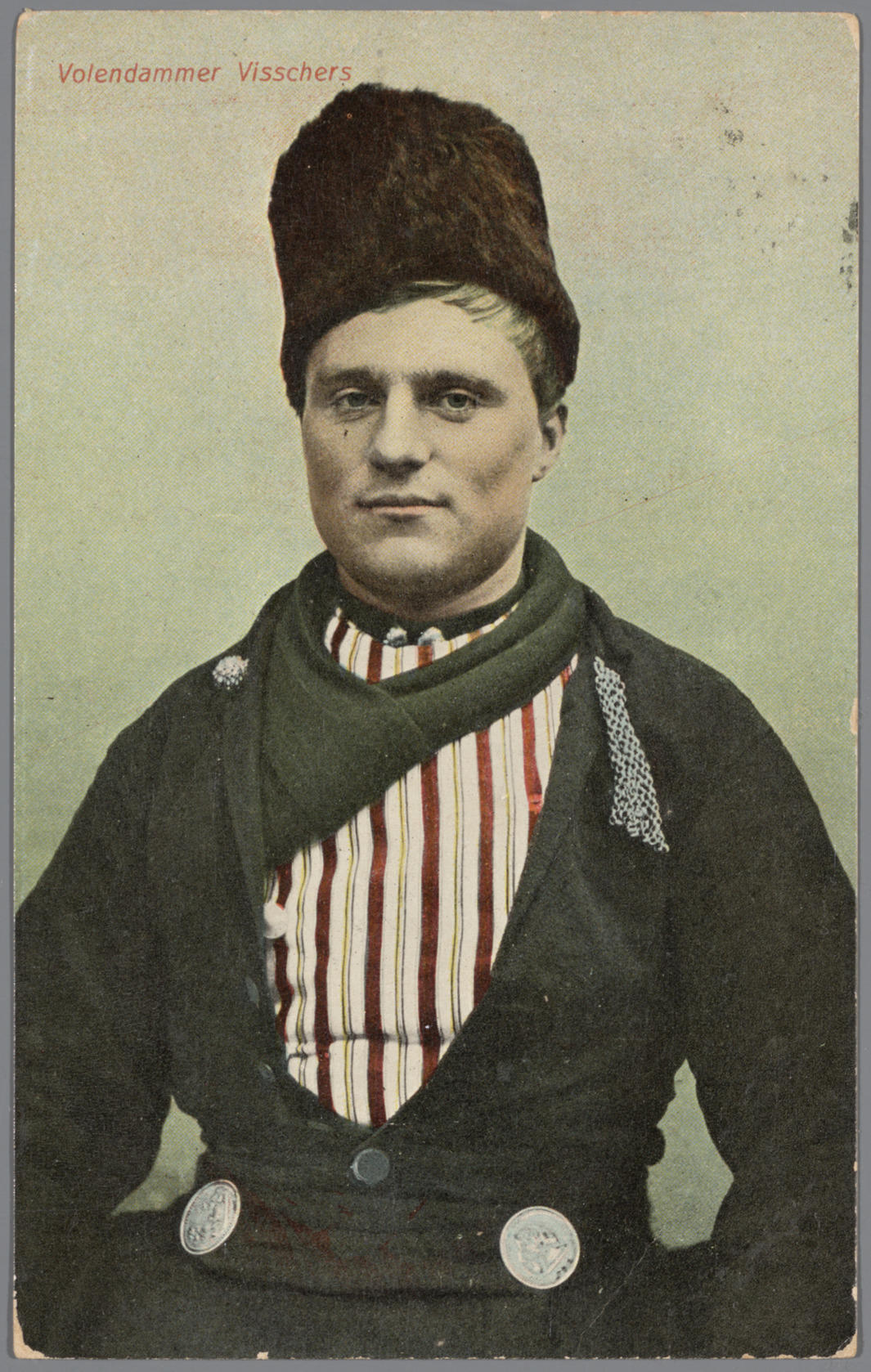 Man, vrouw en meisje in Axelse dracht, aan de haven ...