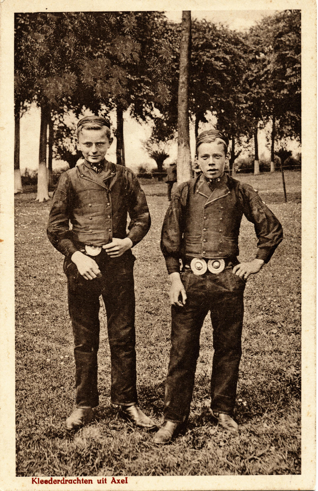 Drie mannen in Walcherse streekdracht, 1930–1940