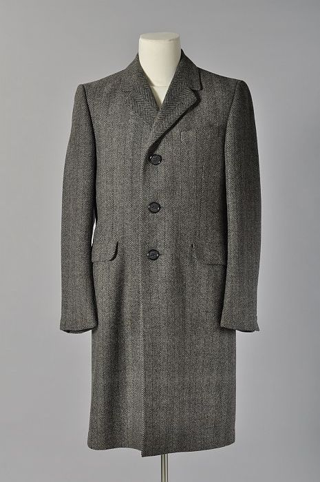 Wollen herenoverjas met ingeweven, zwart-grijs visgr...