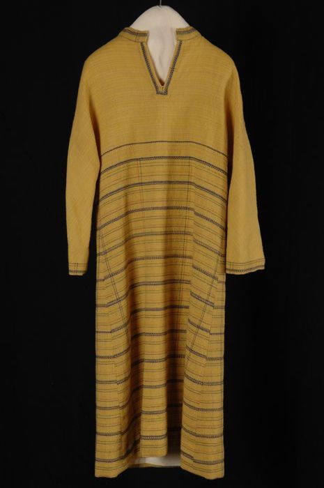 Lange gele jurk met ingeweven streep- / ruitmotief i...