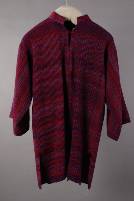 Grof geweven wollen jas, bruin en beige met paarse s...