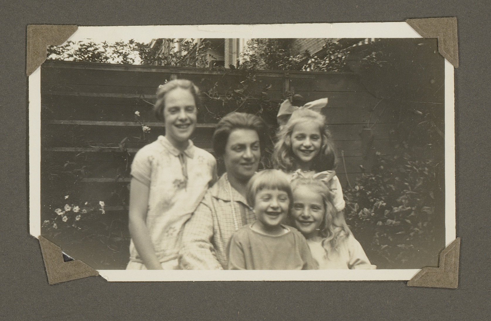 Familieportret in een tuin met een vrouw en vier kin...