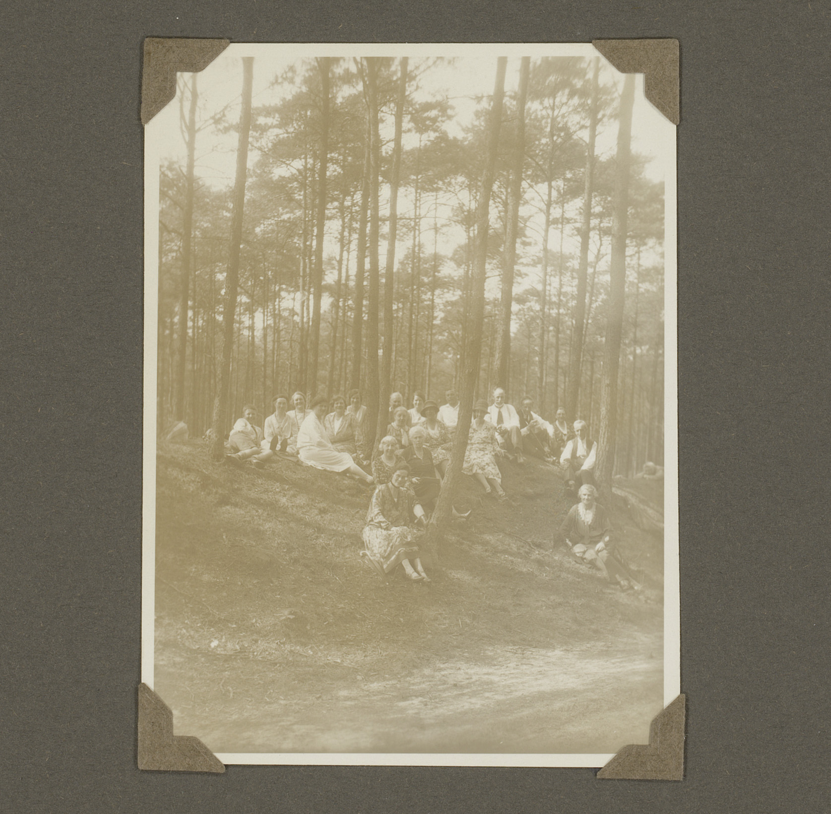 Portret van een groep mensen, zittend tussen bomen i...