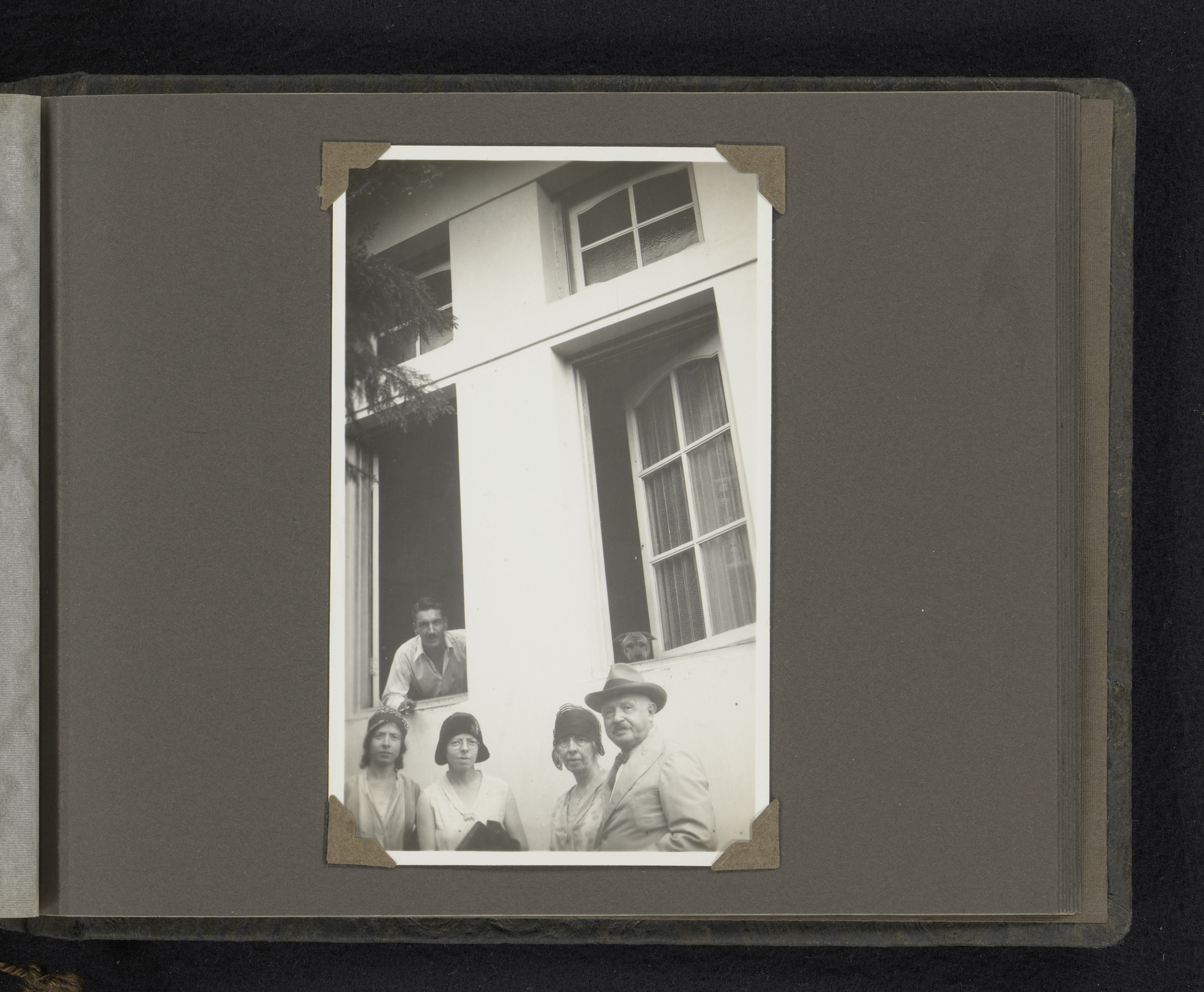 Drie vrouwen en een man staande voor een huis, daara...