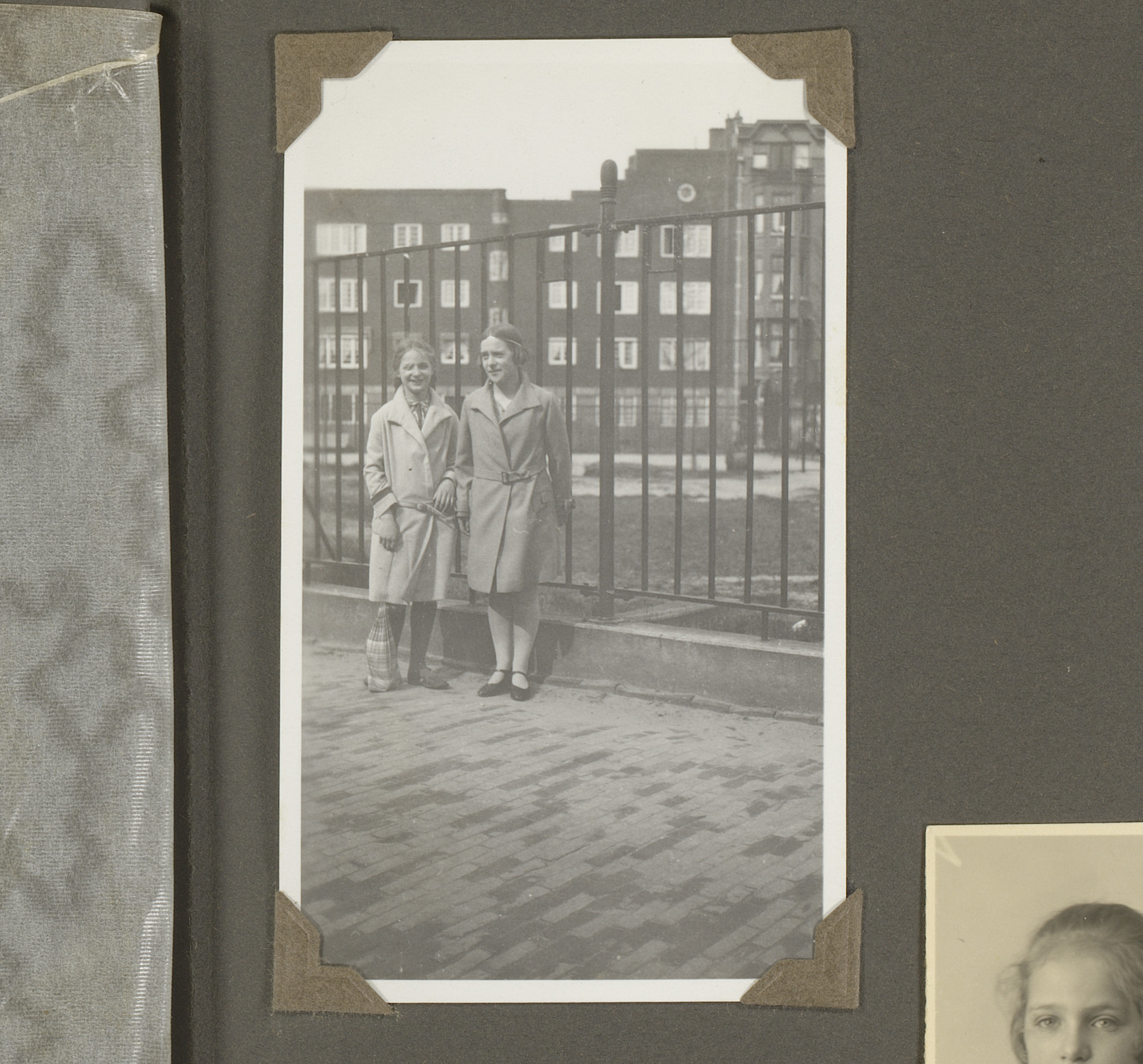 Twee meisjes, staande voor een omheind grasveld