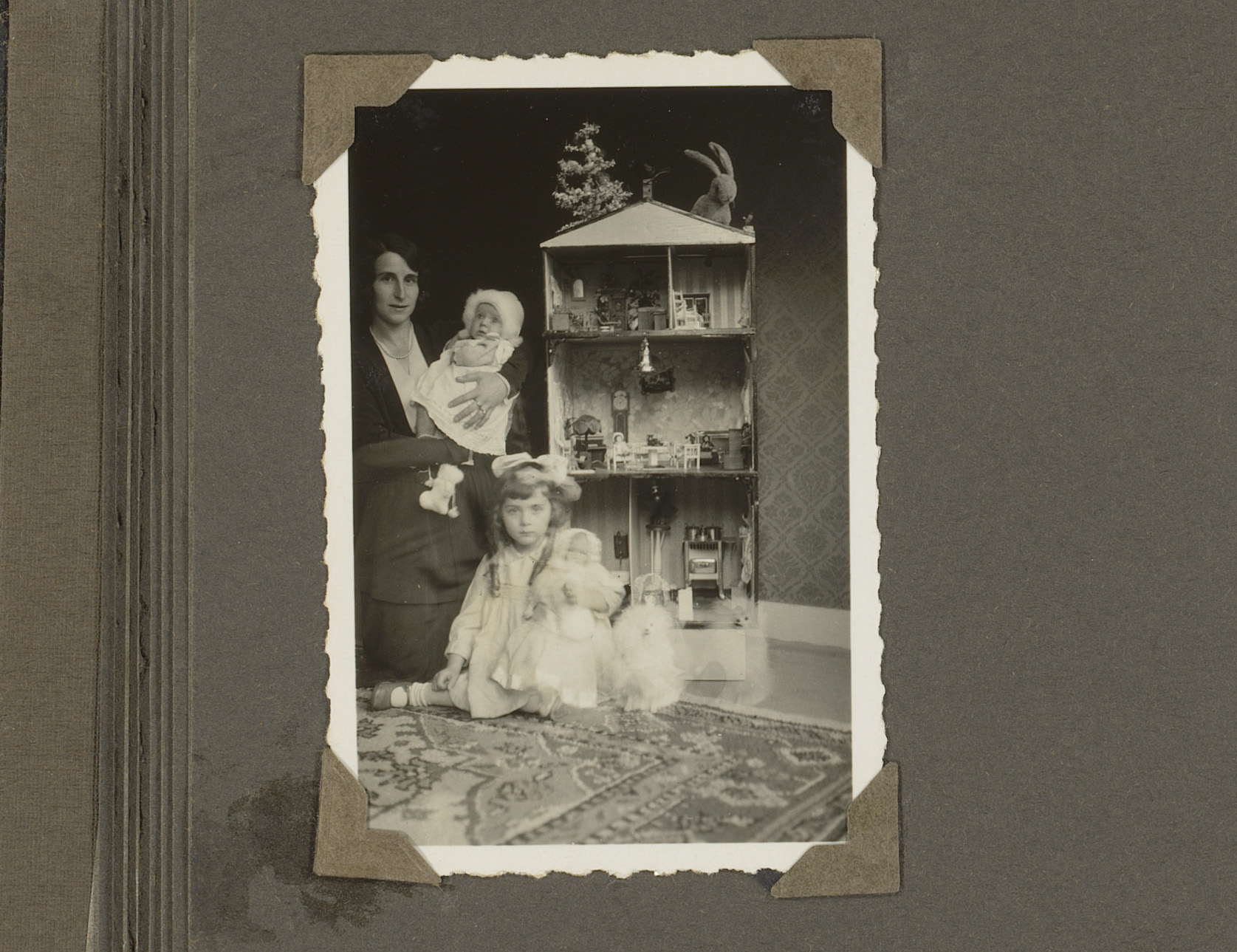 Vrouw met twee kinderen, zittend naast een poppenhuis