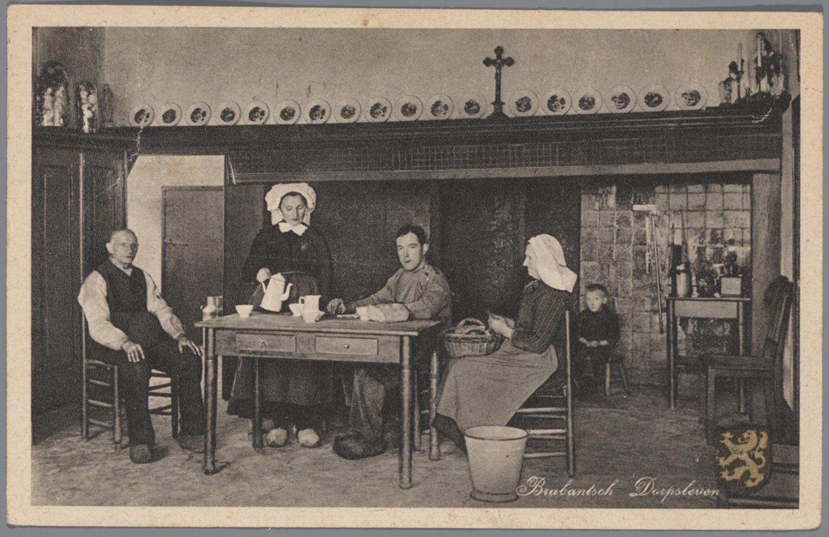 Hakende vrouwen en meisje in Noord-Brabantse dracht