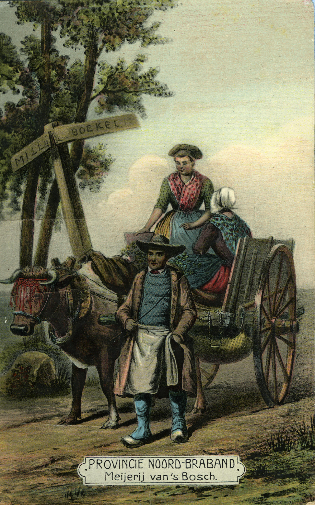 Man, vrouw en kind in boerenkar op pad, Meijerij van...