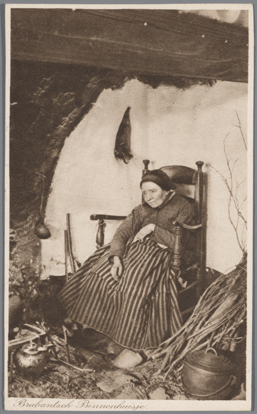 Vrouw in Noord-Brabantse streekdracht bij vuurplaats