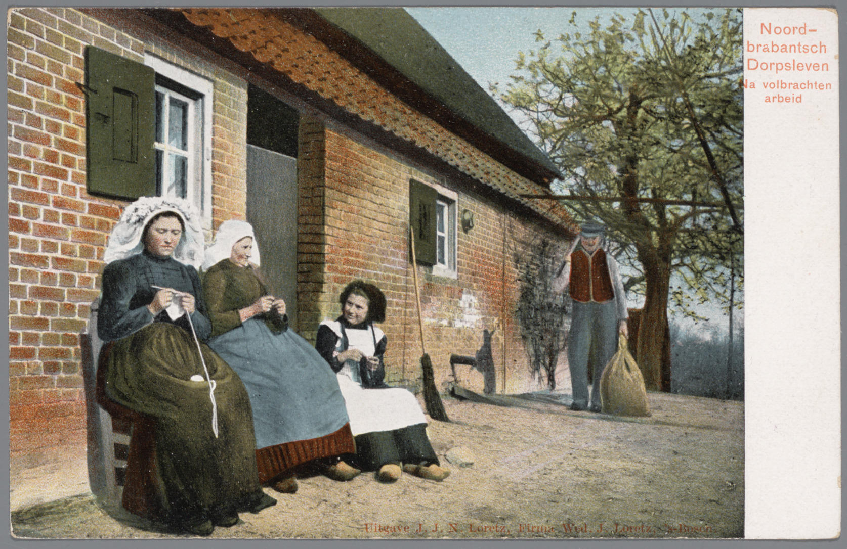 Hakende vrouwen en meisje in Noord-Brabantse dracht
