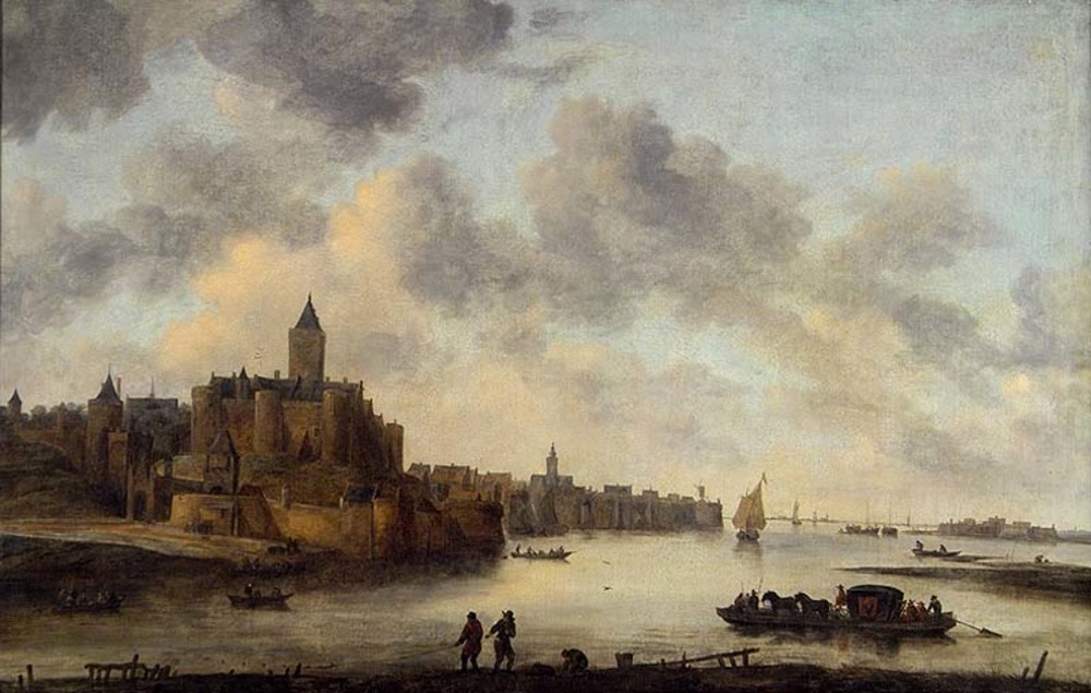 Gezicht op Valkhofburcht en Hunnerpoort met stad, Wa...