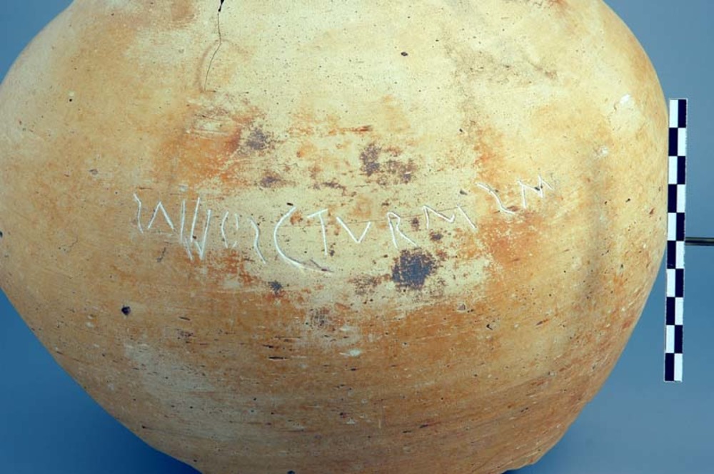 Kruik van aardewerk uit de Romeinse tijd, met inscri...