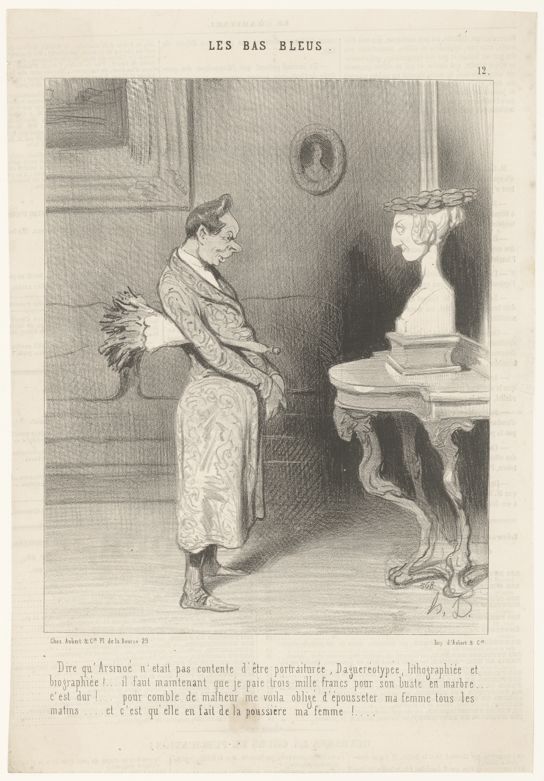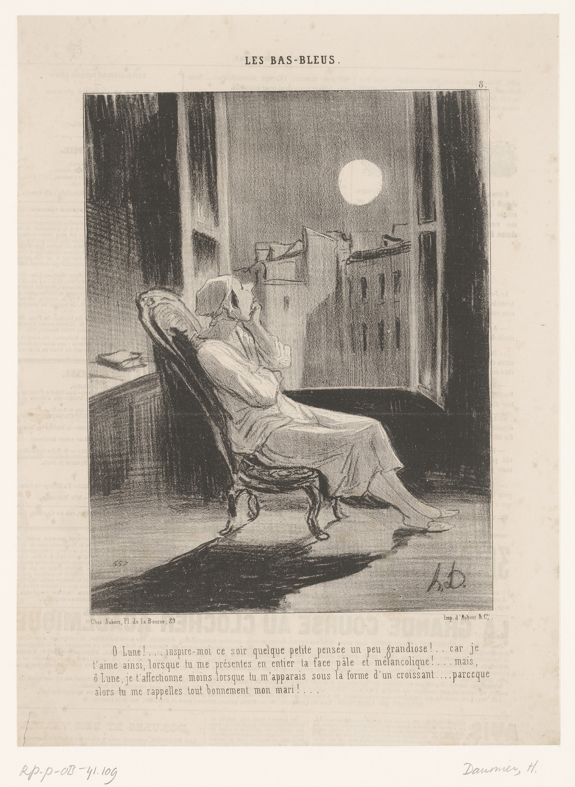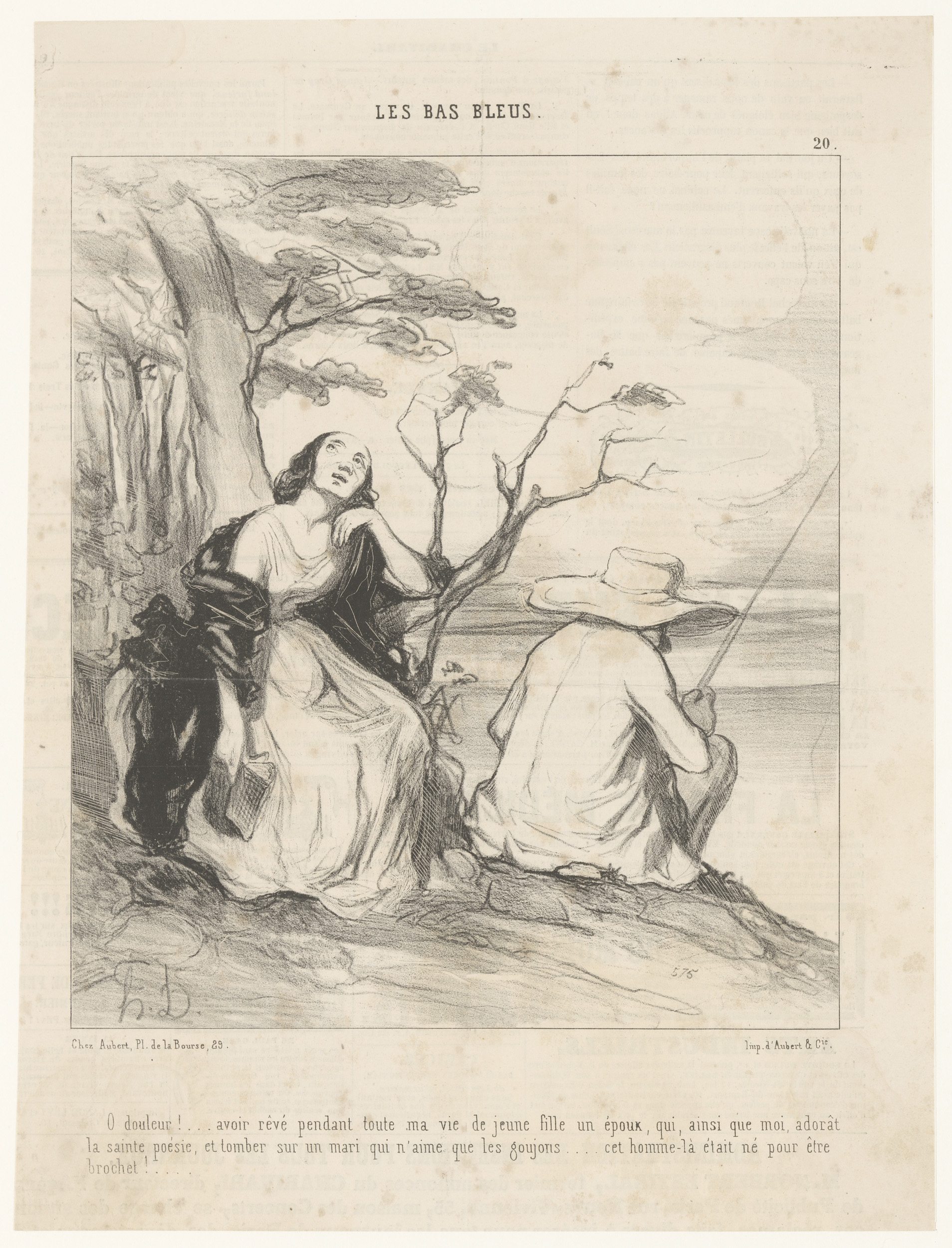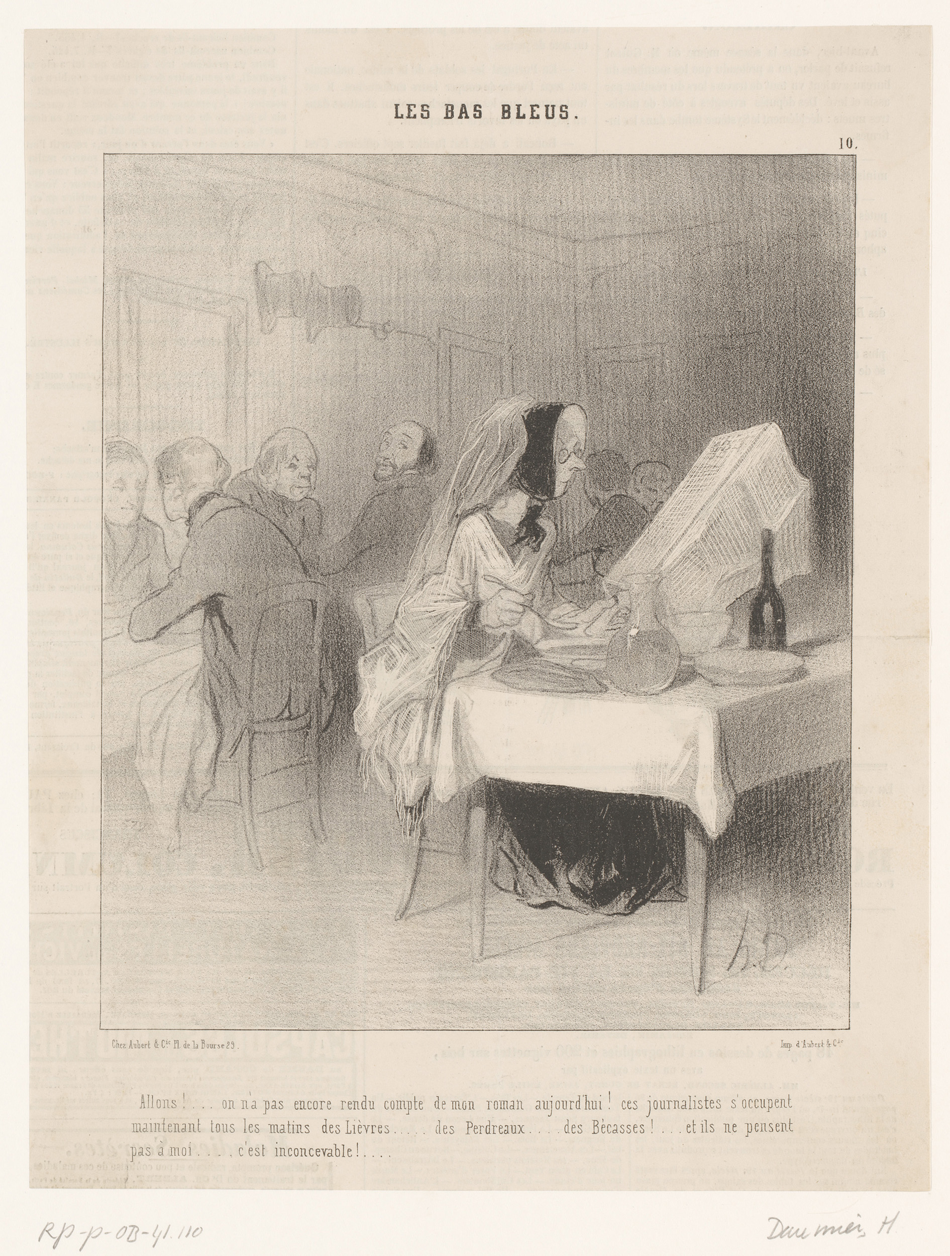 Karikatuur van een schrijvende vrouw in de bibliotheek