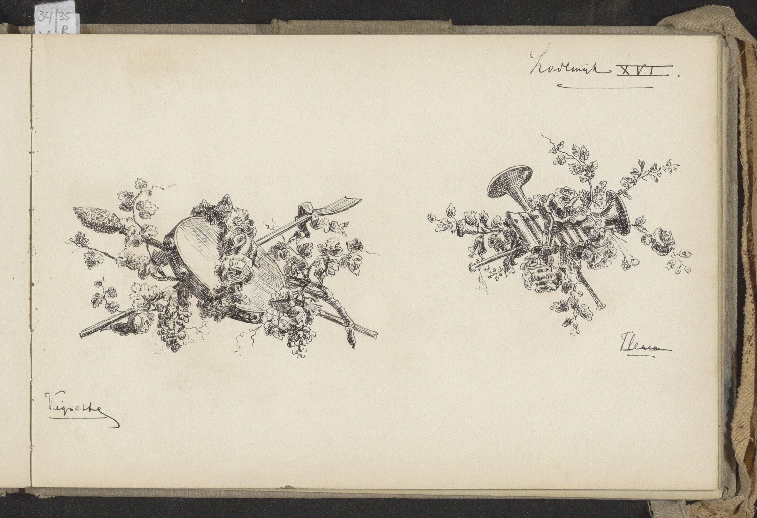 Twee vignetten met muziekinstrumenten uit de tijd va...