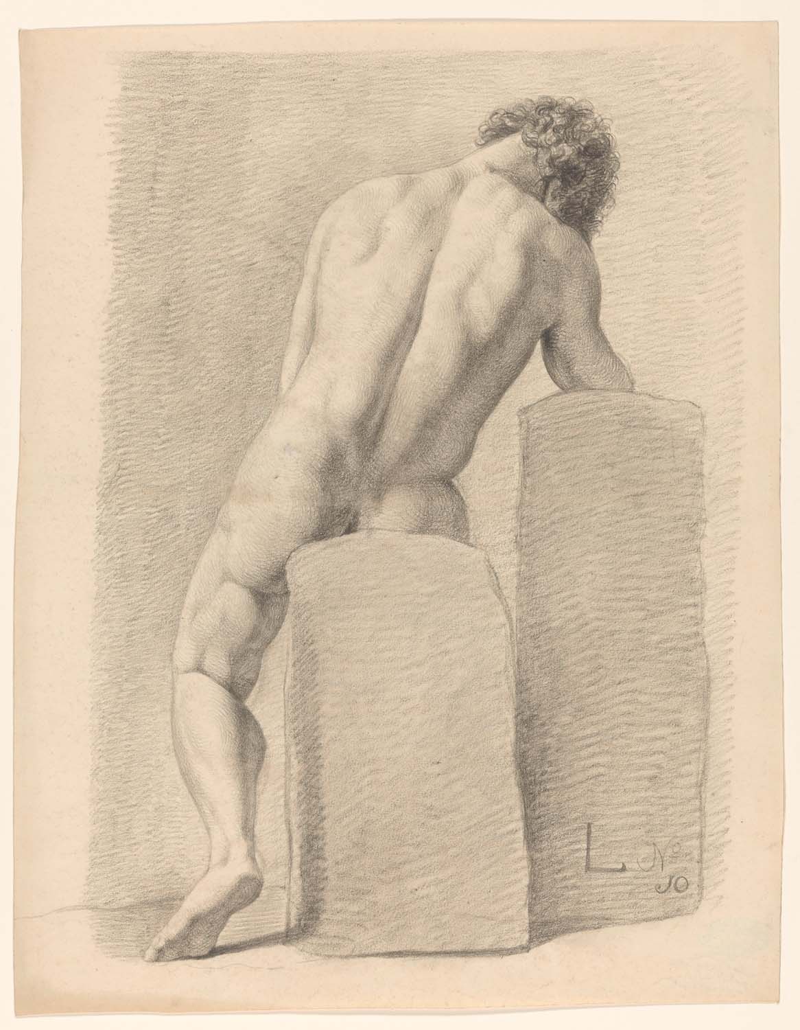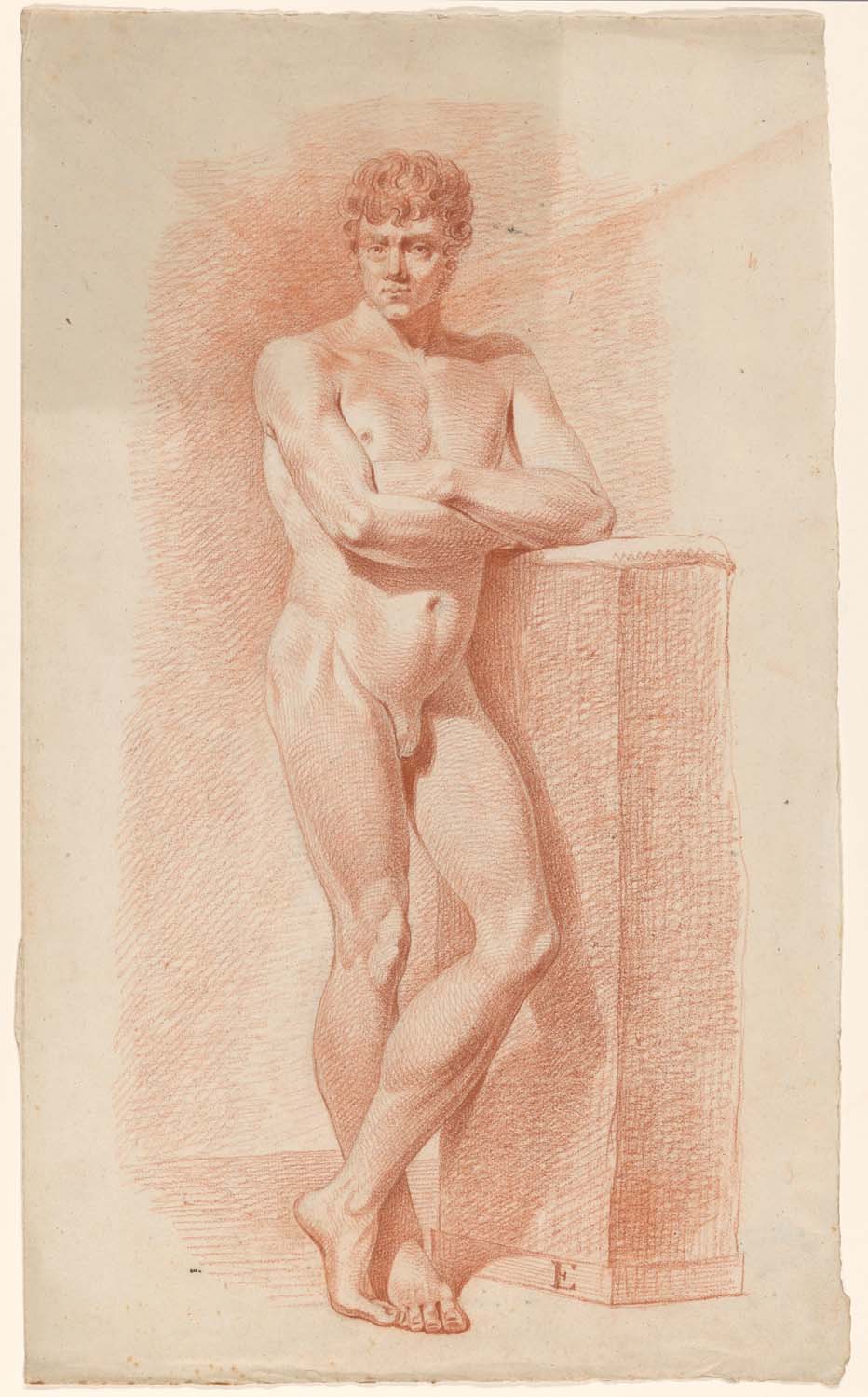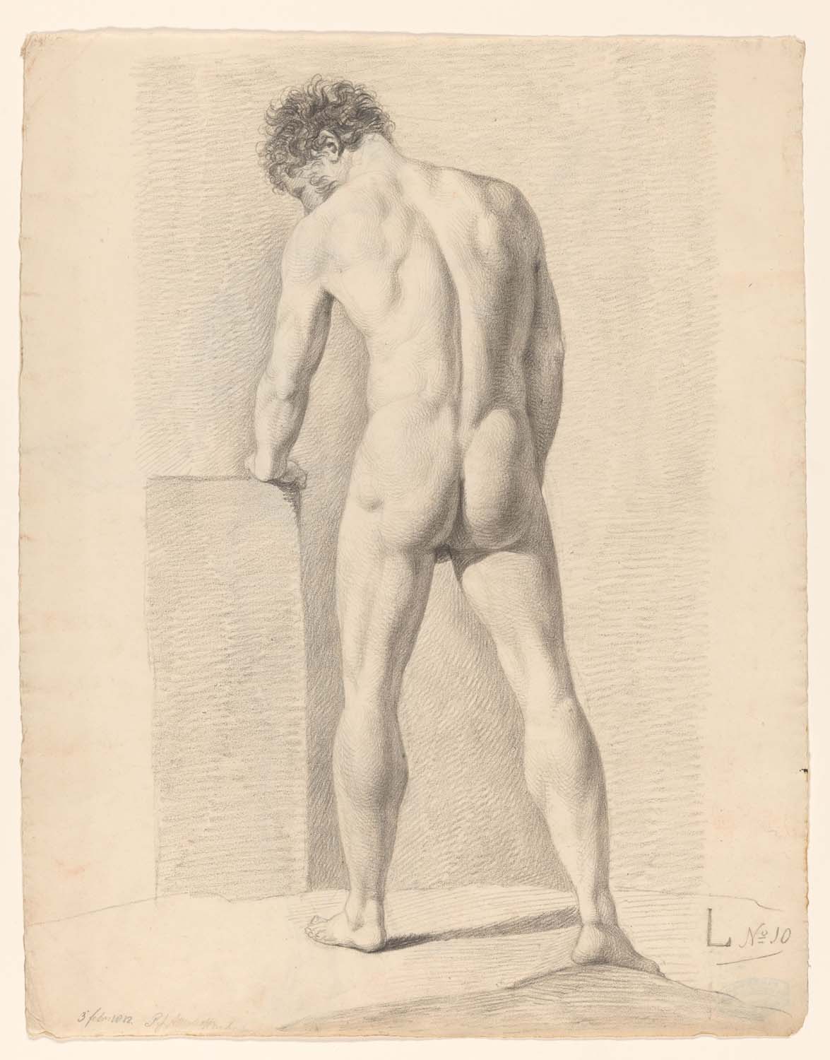 Staand mannelijk naakt leunend op een blok, van vore...