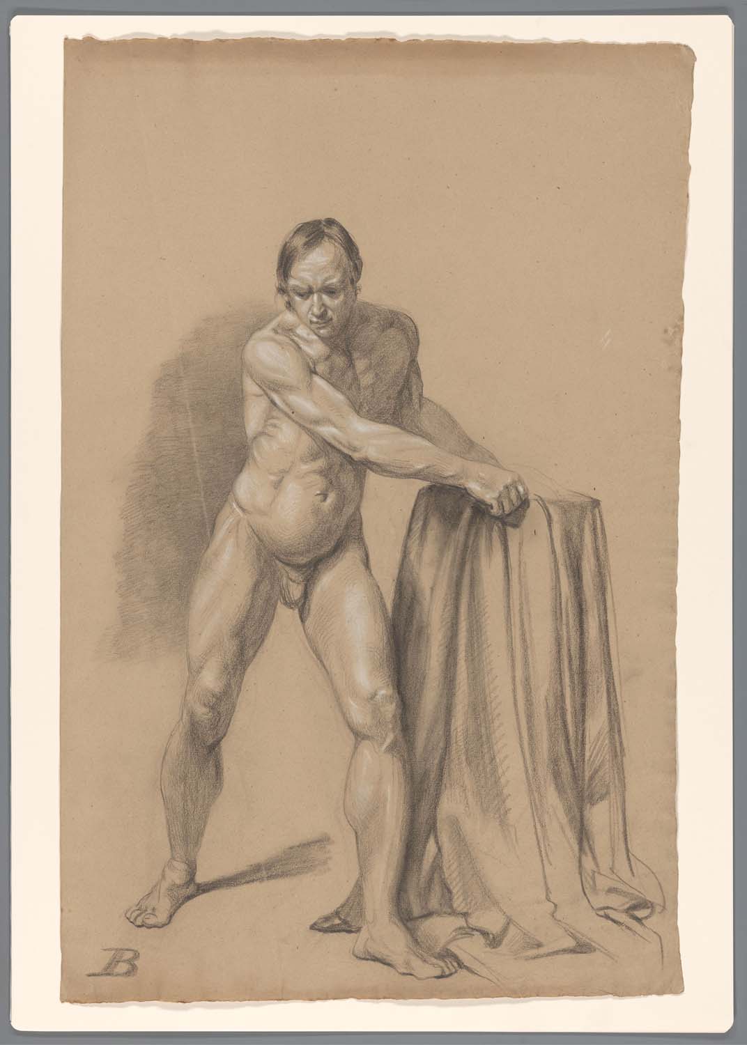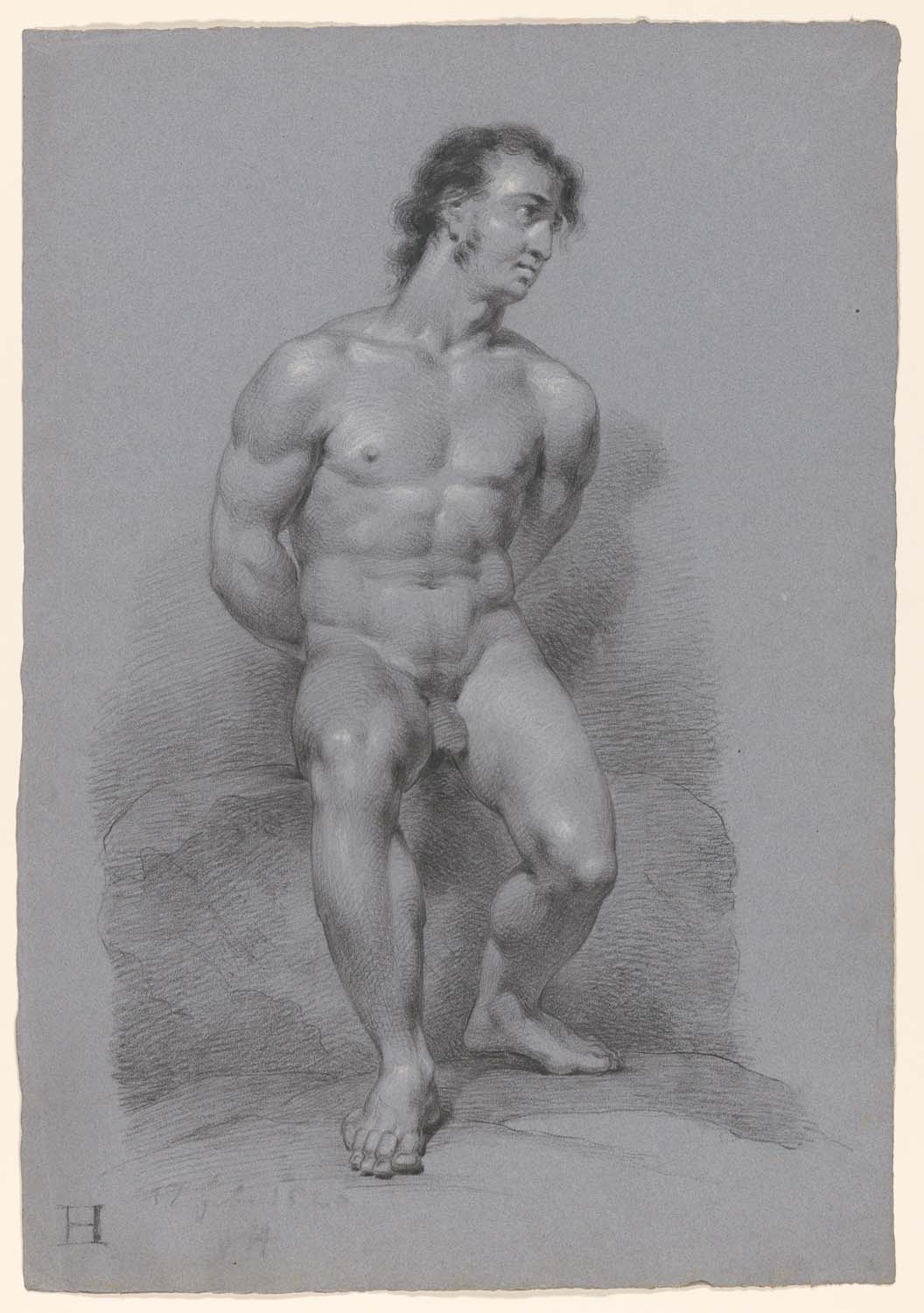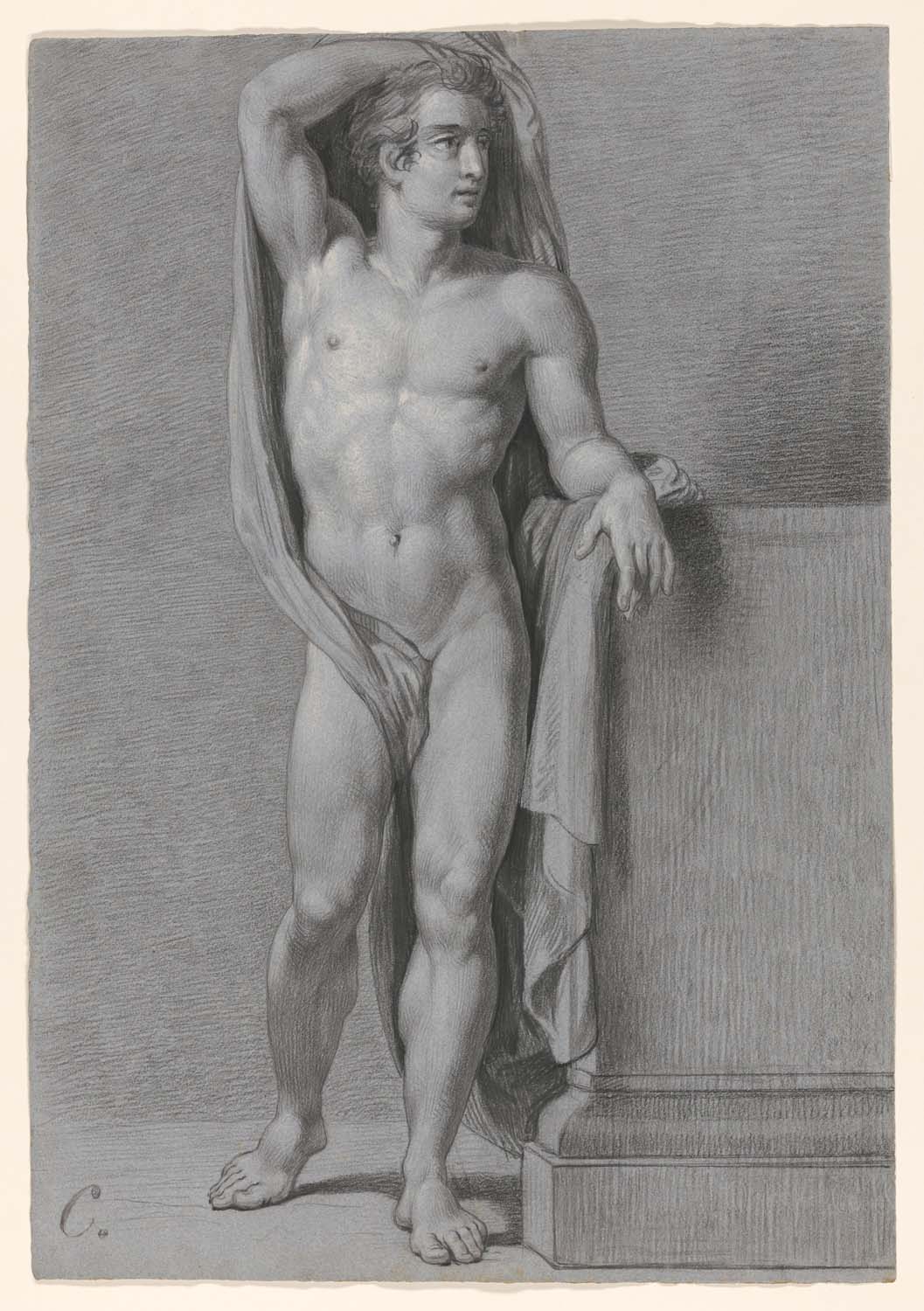Staand mannelijk naakt leunend op een blok, van vore...