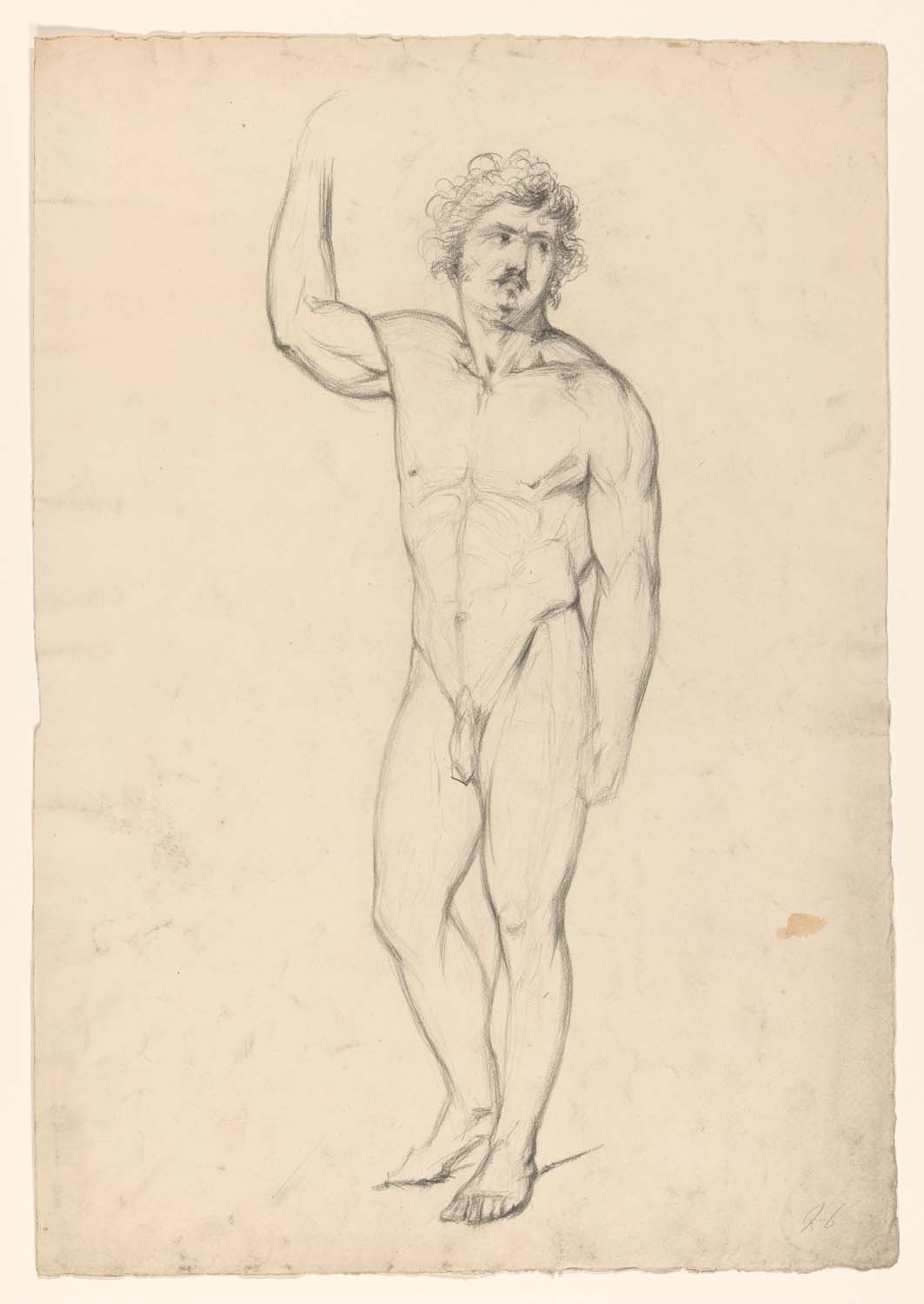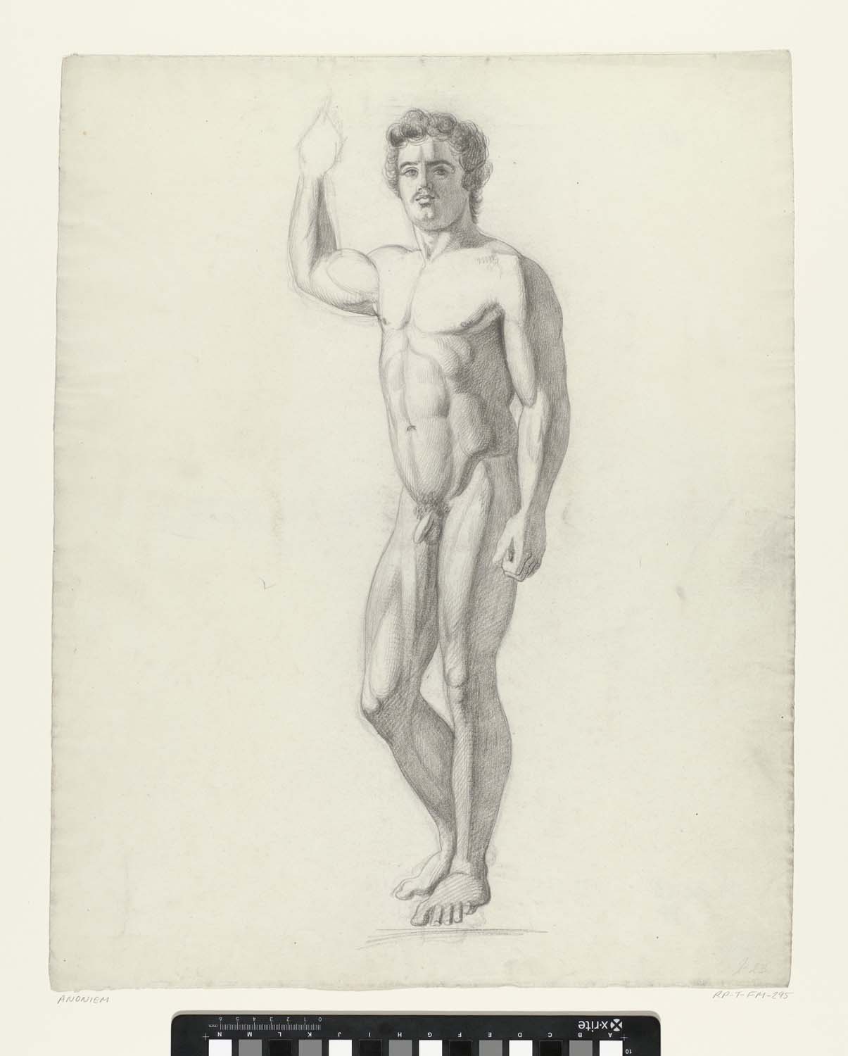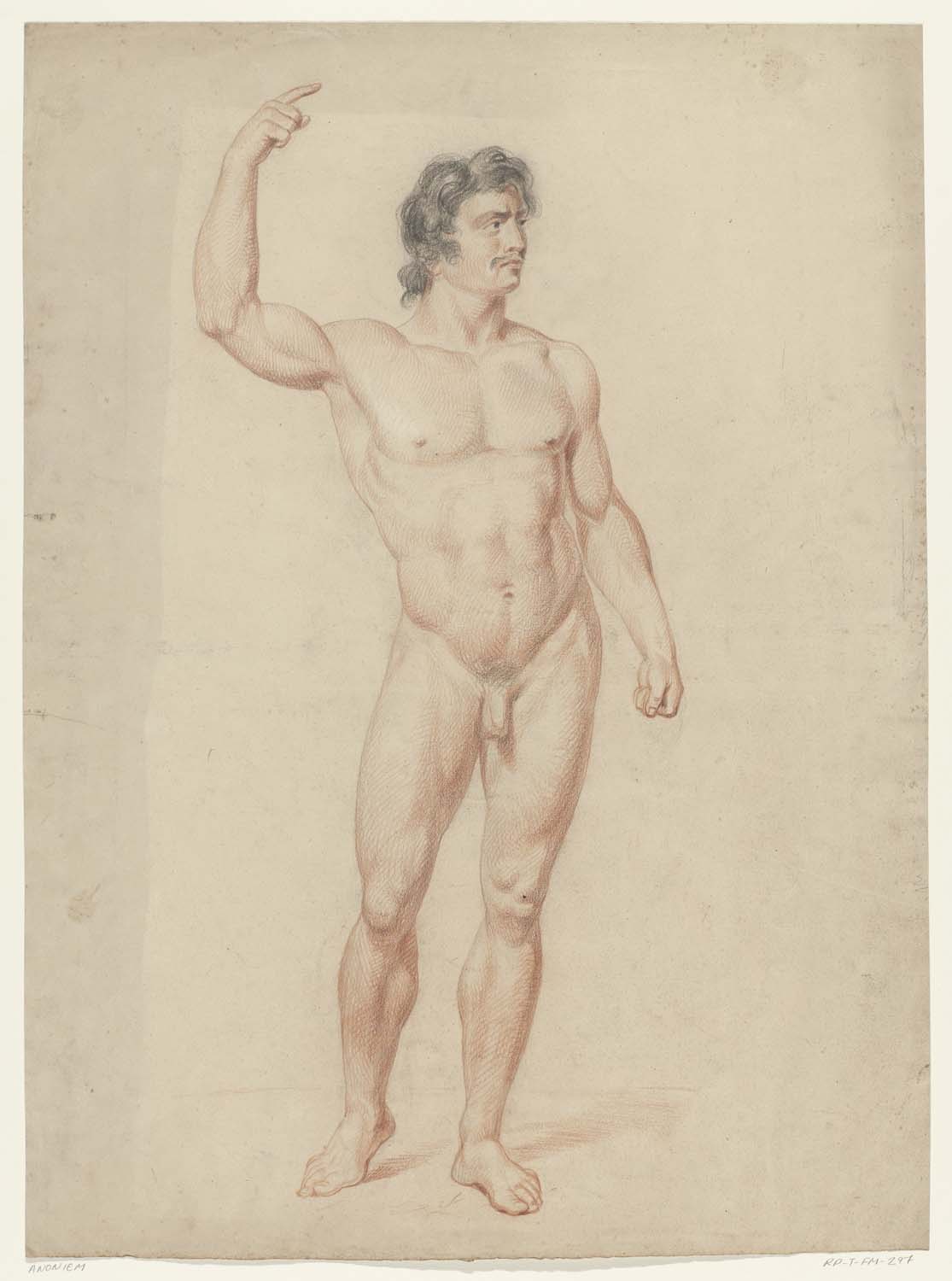 Staand mannelijk naakt met opgeheven arm, naar rechts