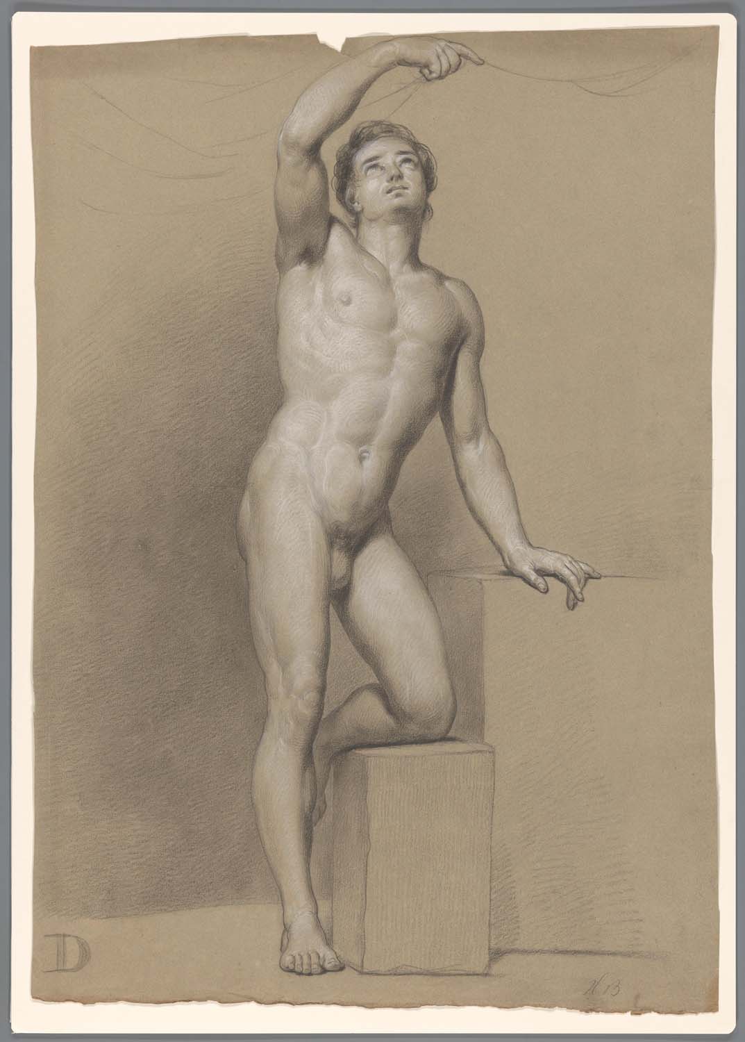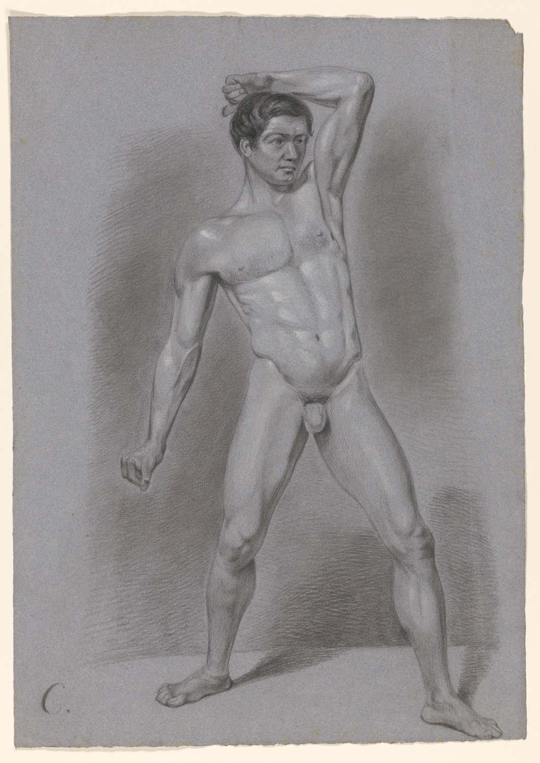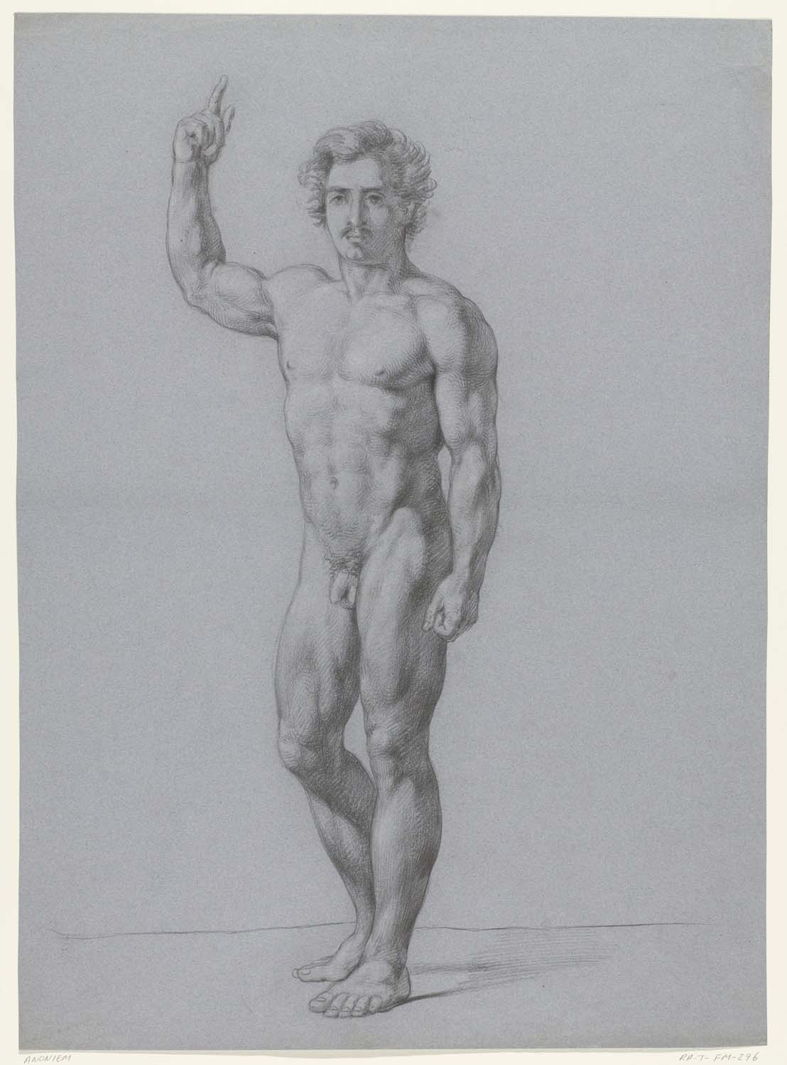 Staand mannelijk naakt met opgeheven arm, naar rechts