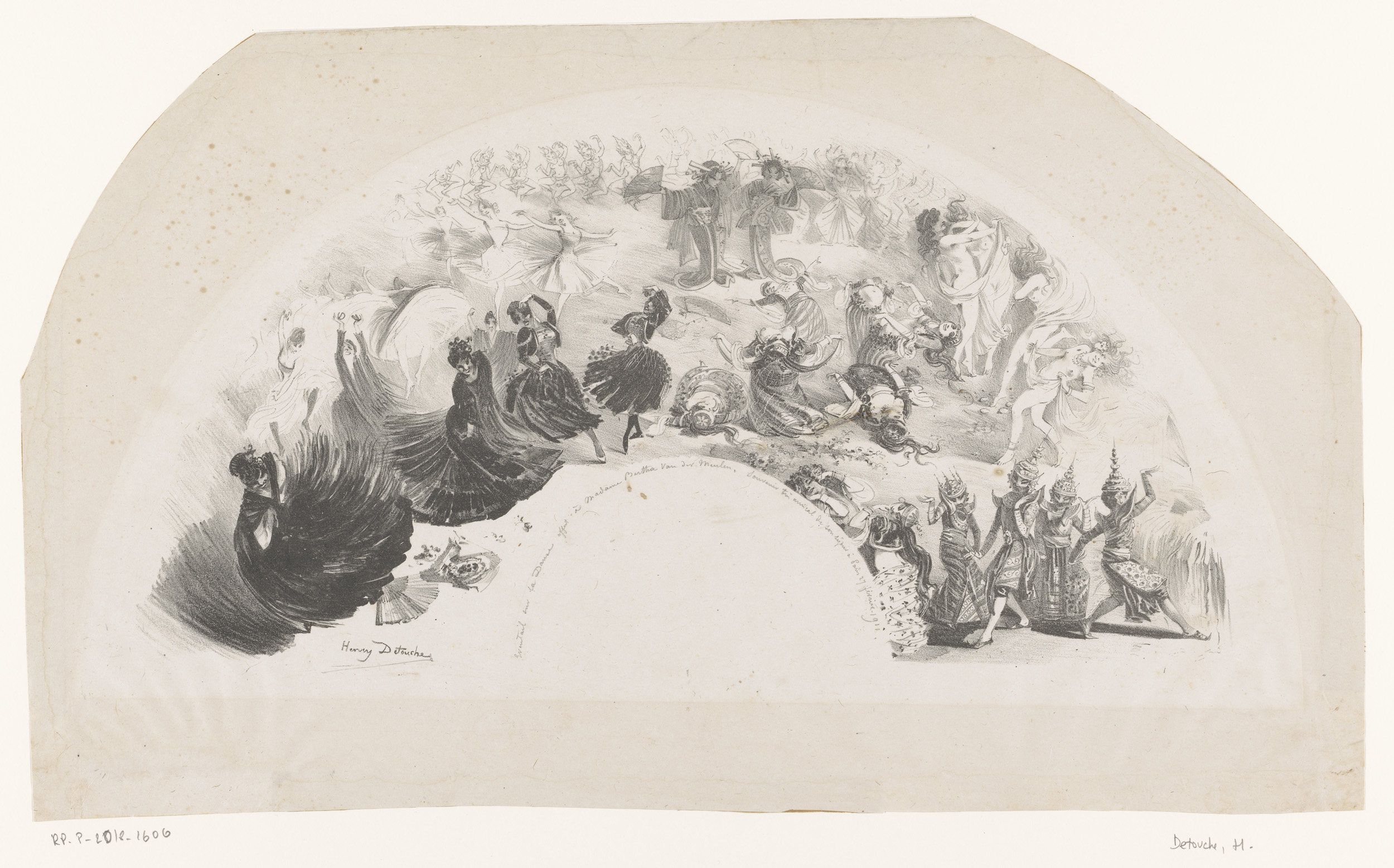 Waaiervormige prent met danseressen in verschillende...
