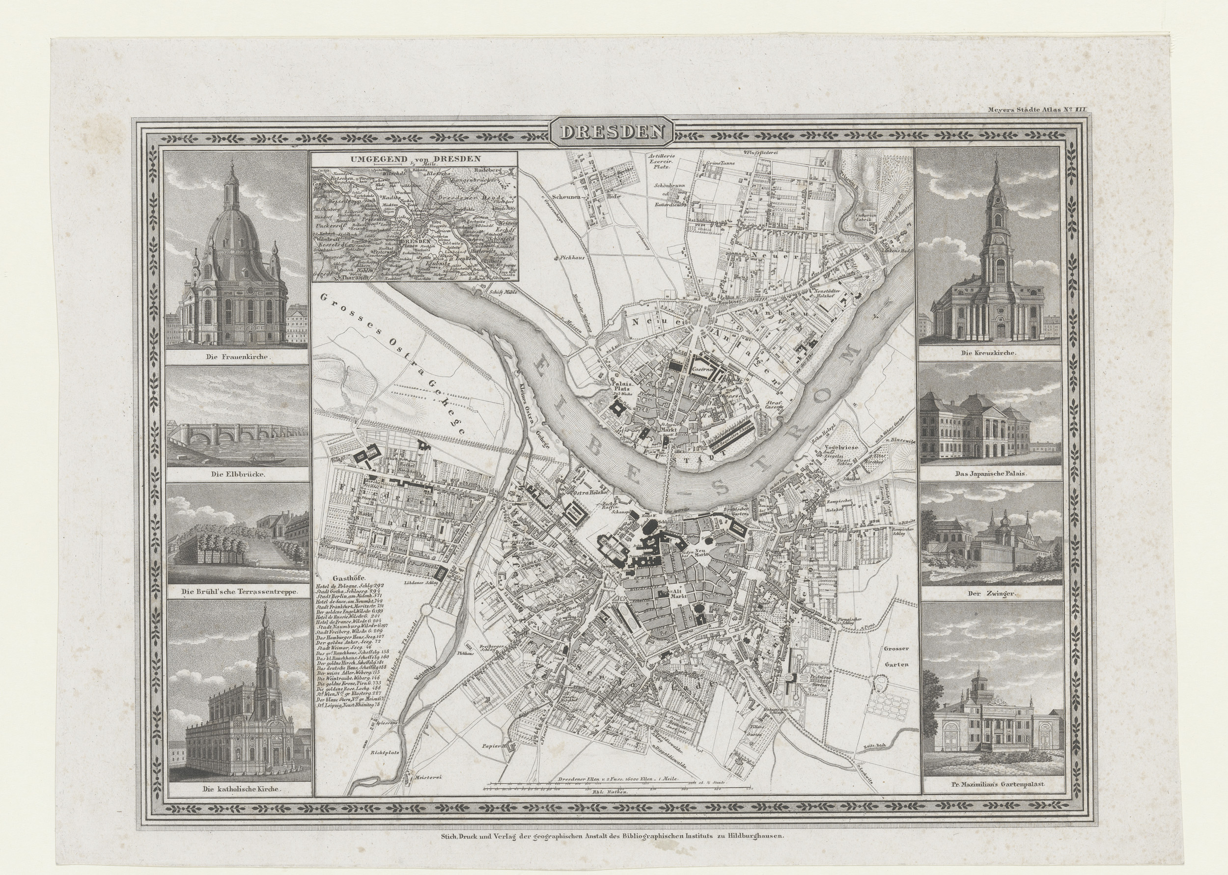 Plattegrond van Dresden met gezichten op gebouwen in...