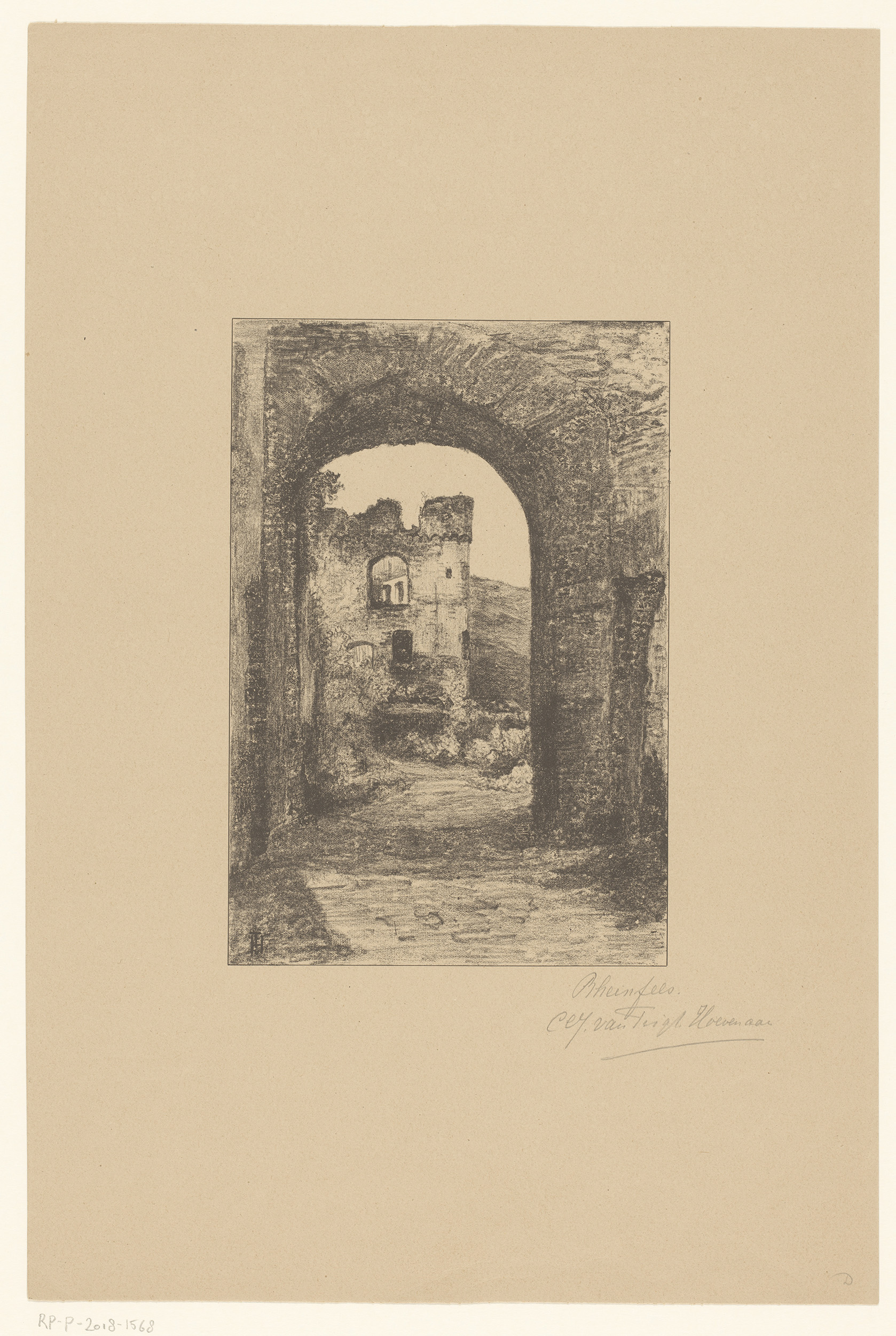 Gezicht door een poort van de ruïne van Burcht Rhein...