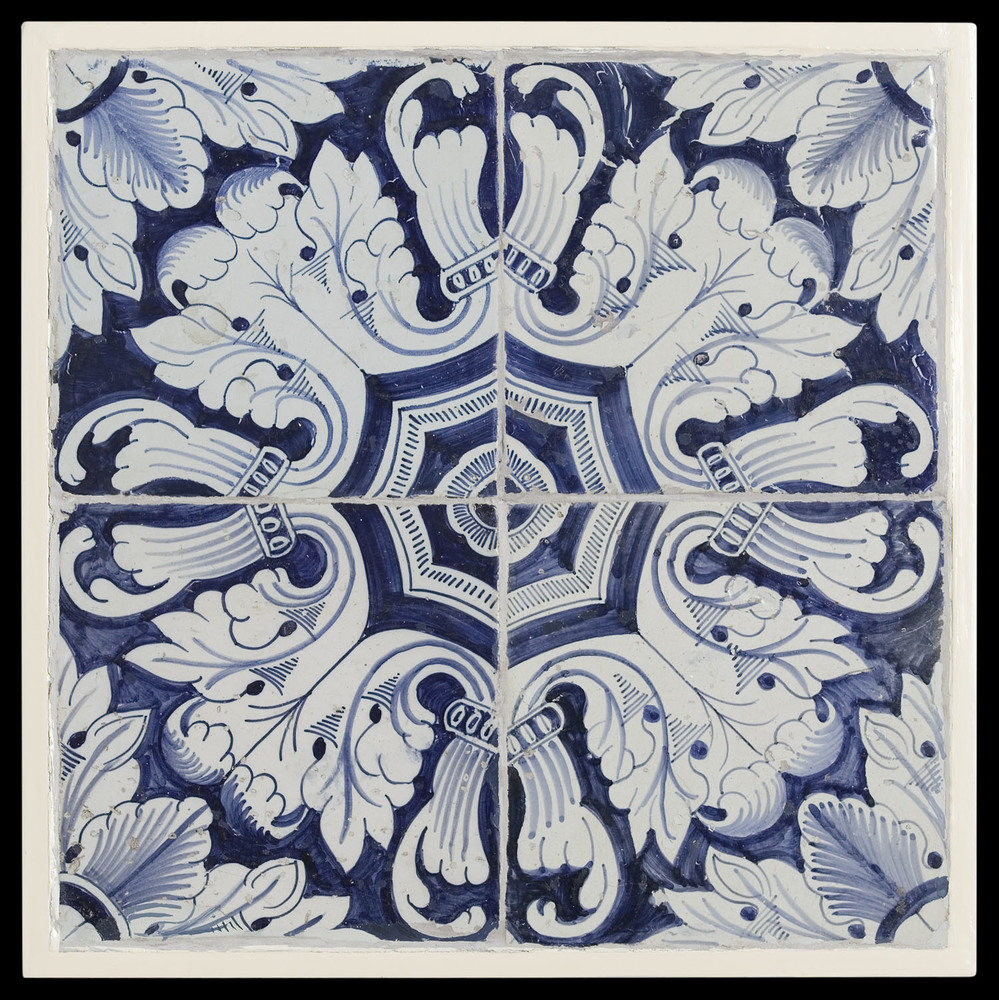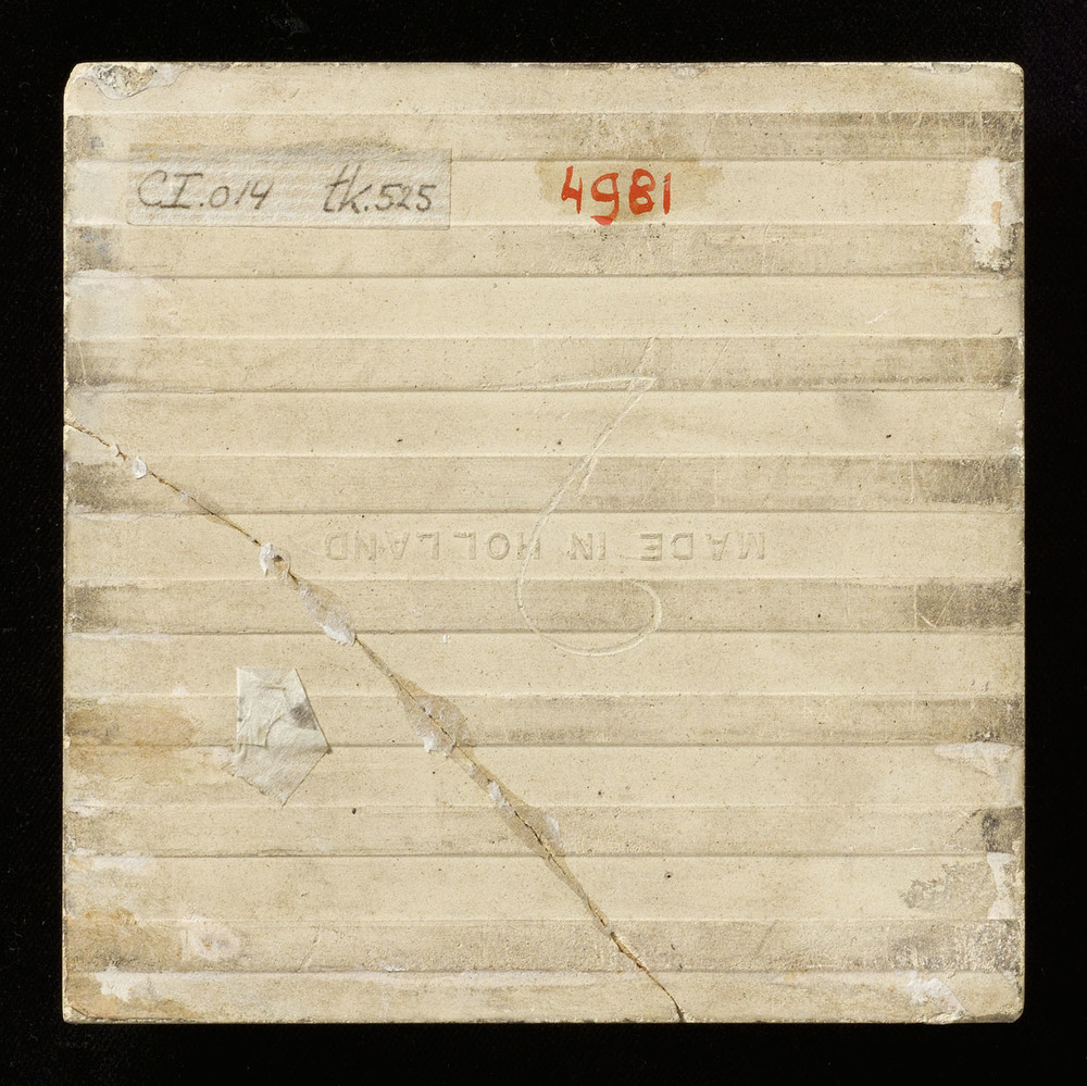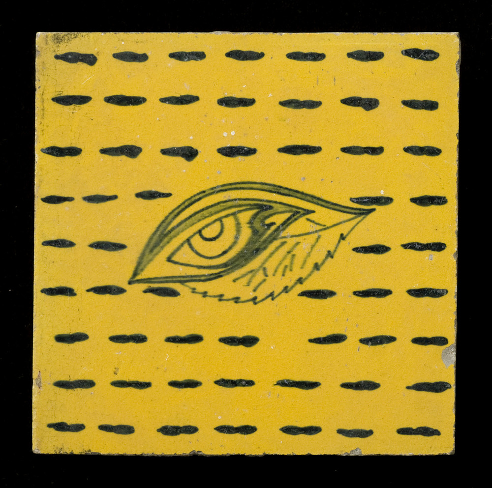 Tegel in tinglazuur, voorstellende blad met oog, ver...