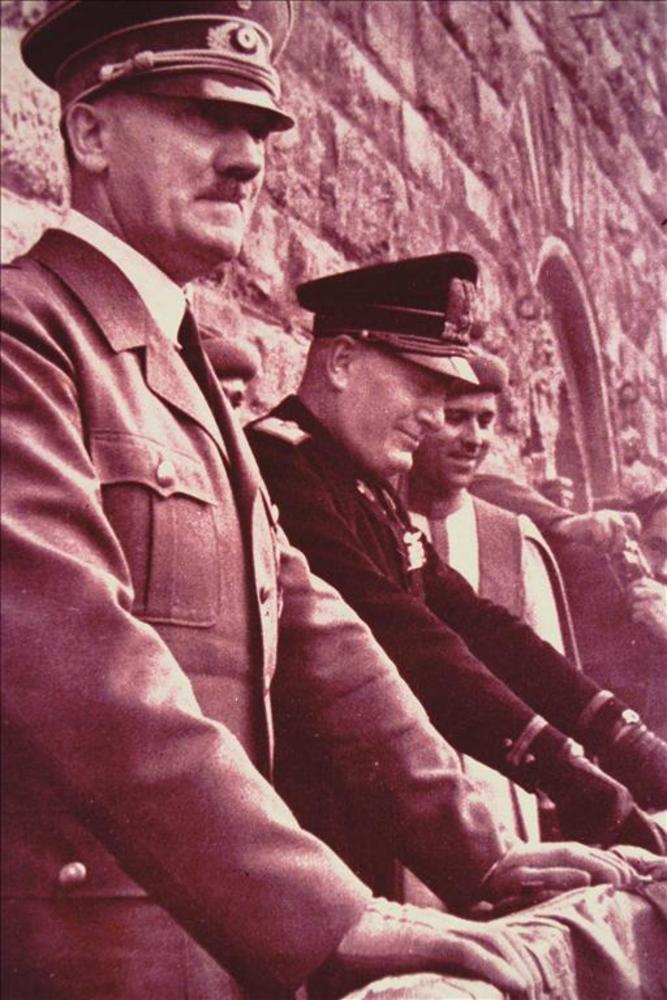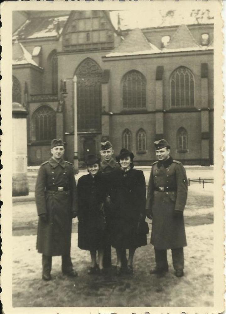 Drie Duitse soldaten en twee vrouwen voor een kerk