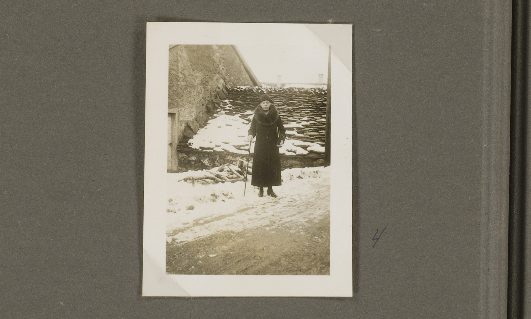 Vrouw met wandelstok, staande voor een huis bij Pezzolo