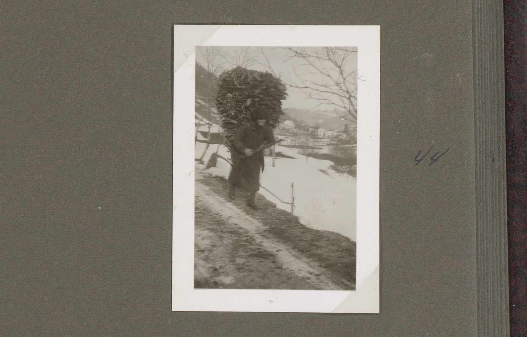 Vrouw met een mand op haar rug op een pad nabij Pezz...