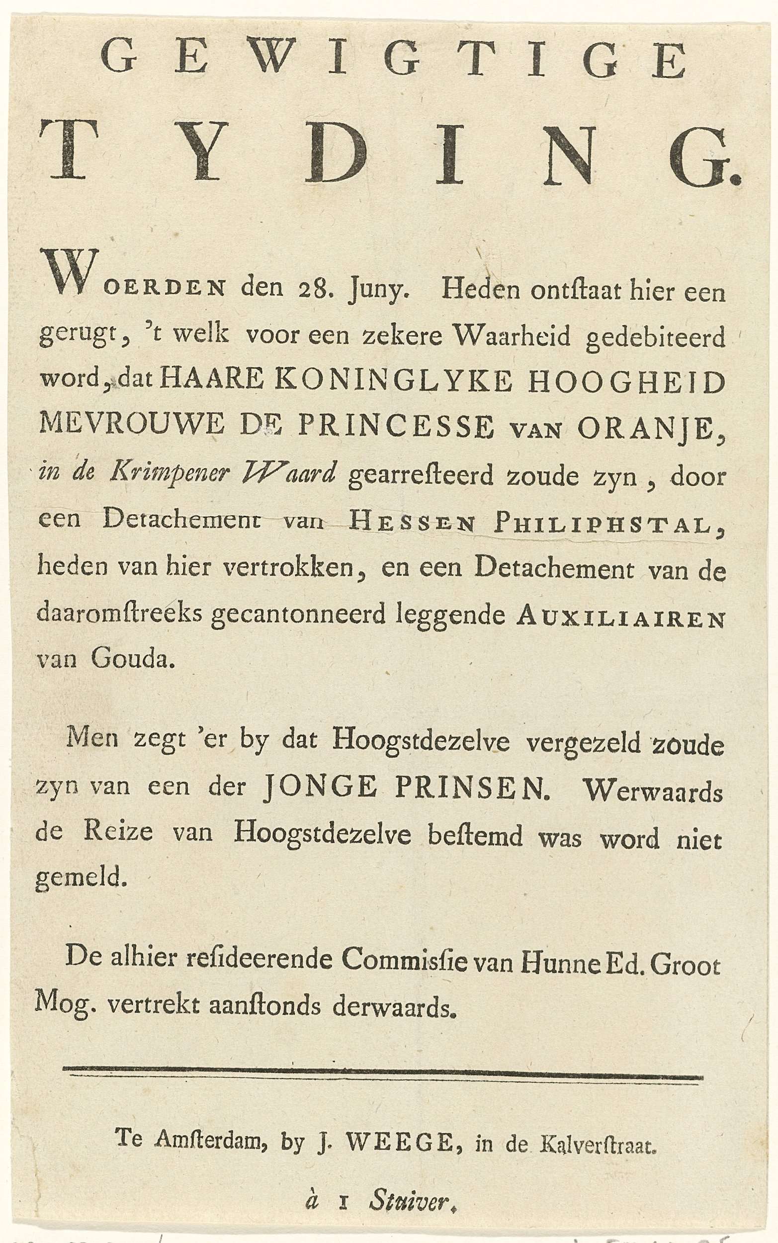 Bekendmaking van de aanhouding van prinses Wilhelmin...