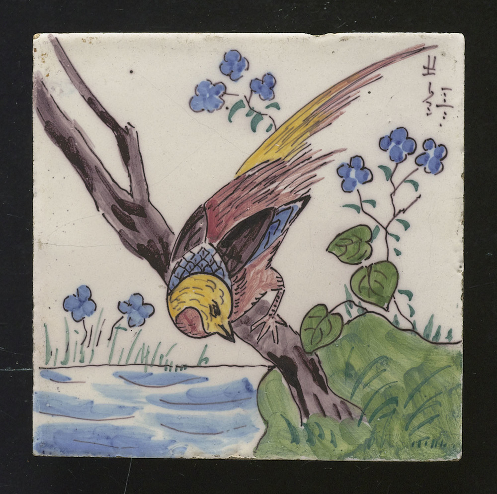 Tegel met tinglazuur, voorstellende een vogel op een...