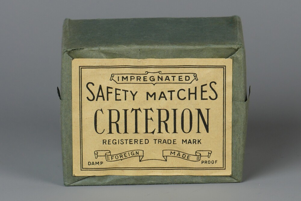 luciferdoosjes met inhoud, in grijs papieren verpakk...