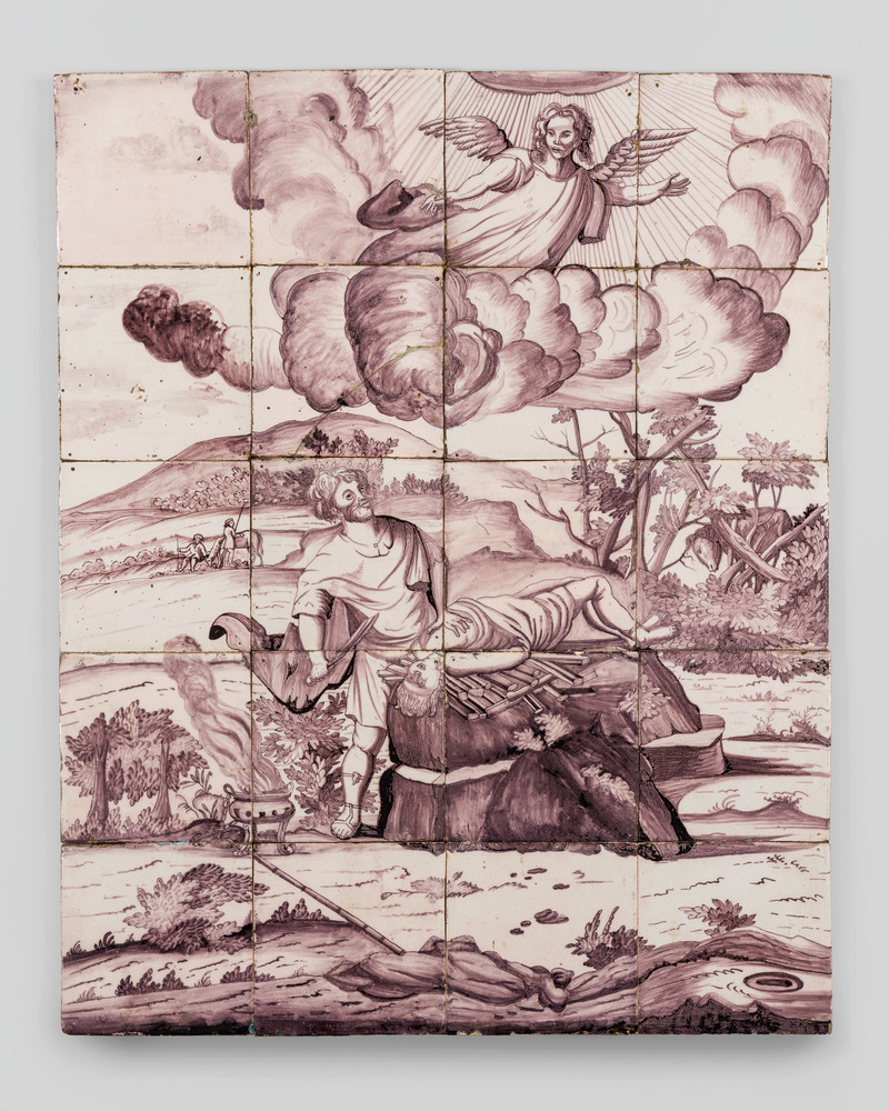 Tableau van aardewerk tegels met tinglazuur, met bij...
