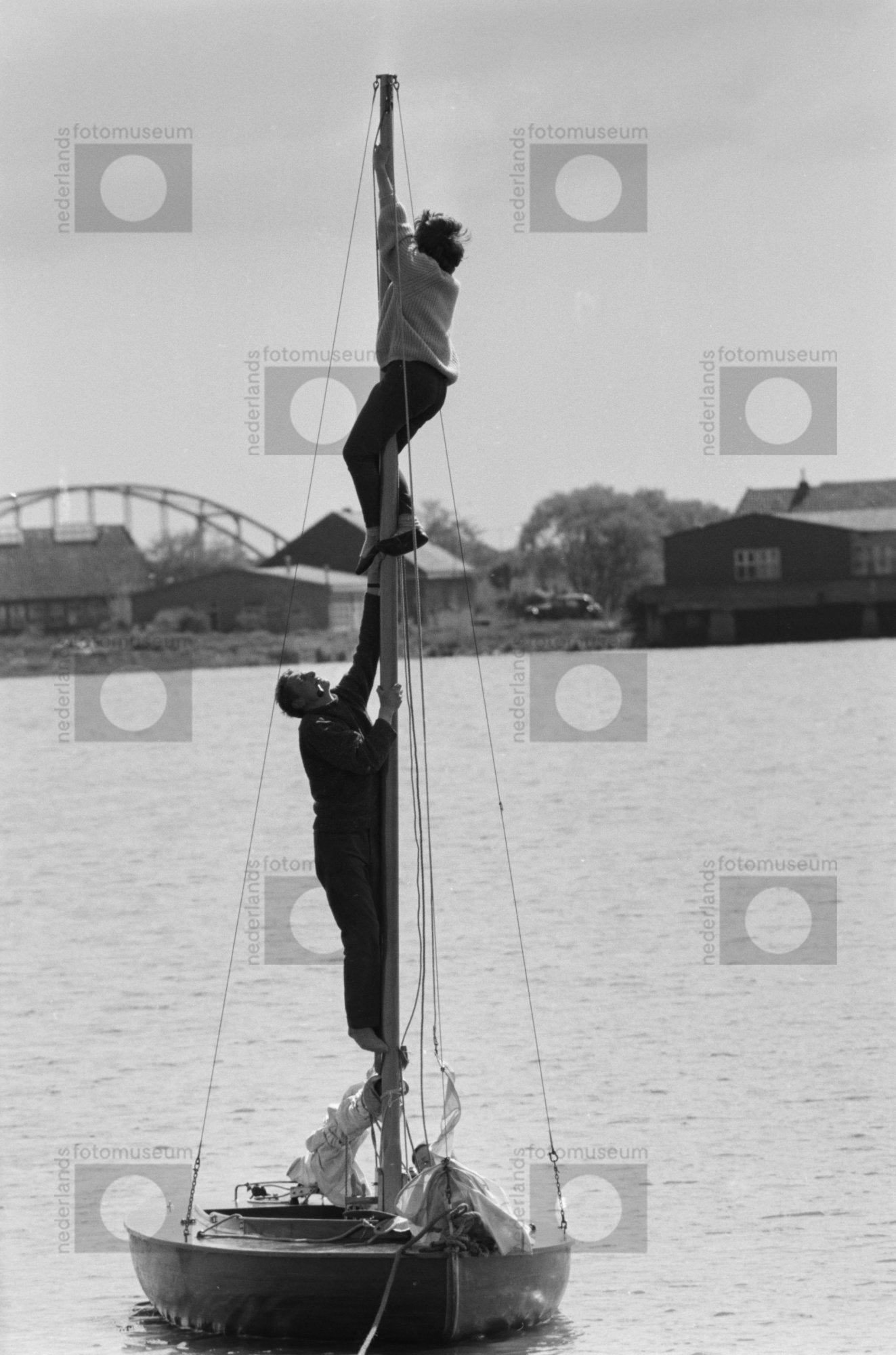 Amsterdam. Buiten-IJ. Vrouw klimt in de mast van een...