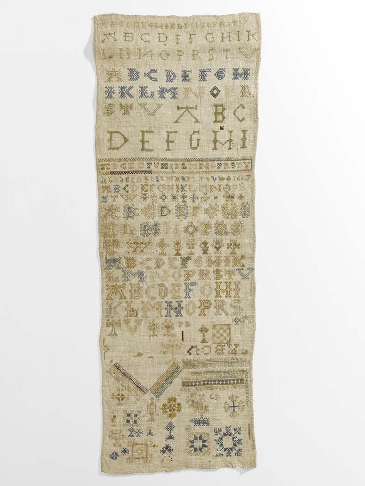 Lettermerklap op grof linnen, met alfabet, rijk vers...