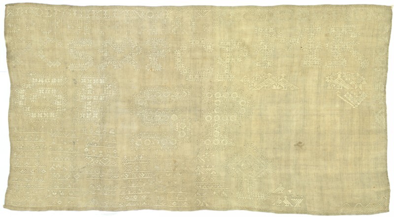 Merkletterlap vol geborduurd op los geweven linnen, ...