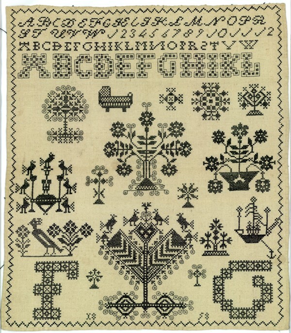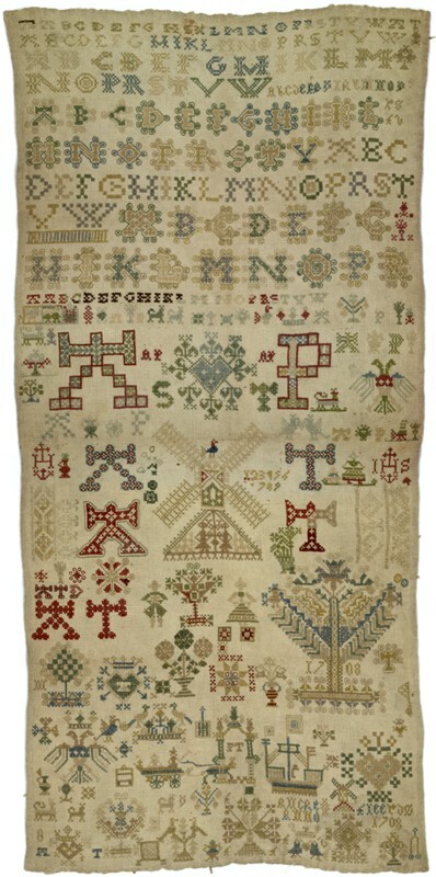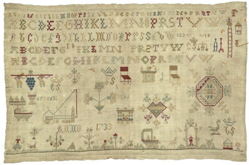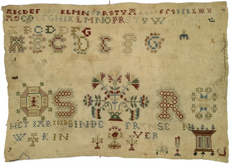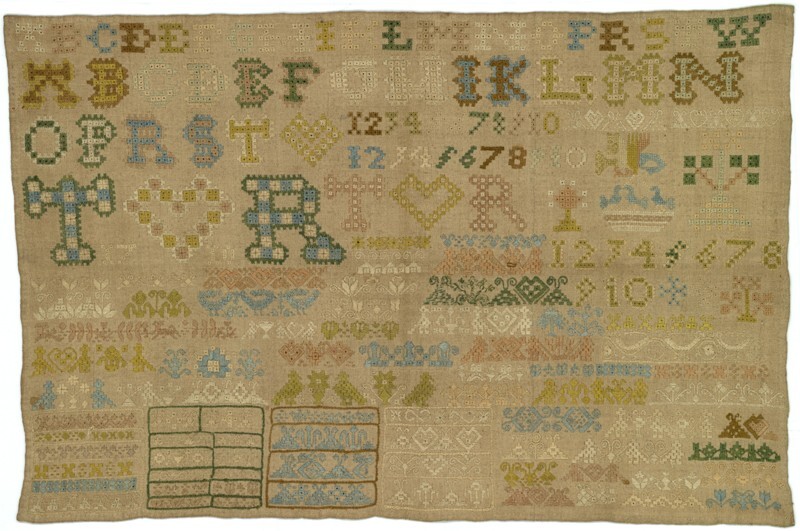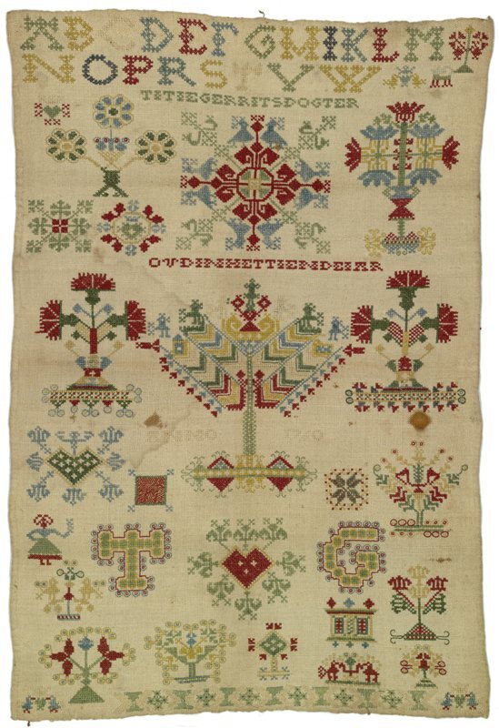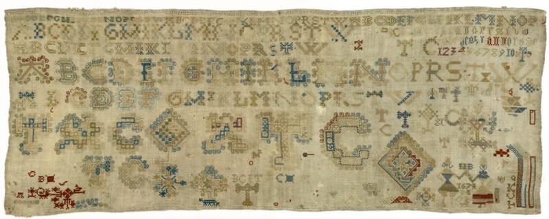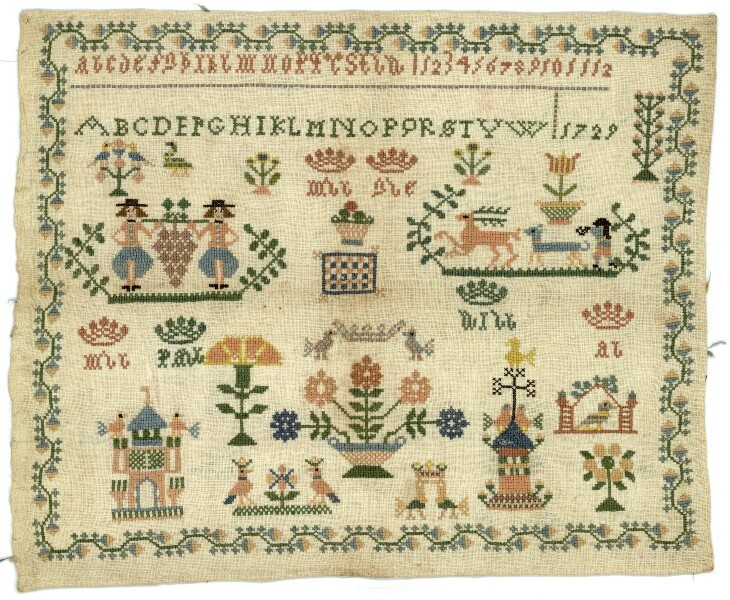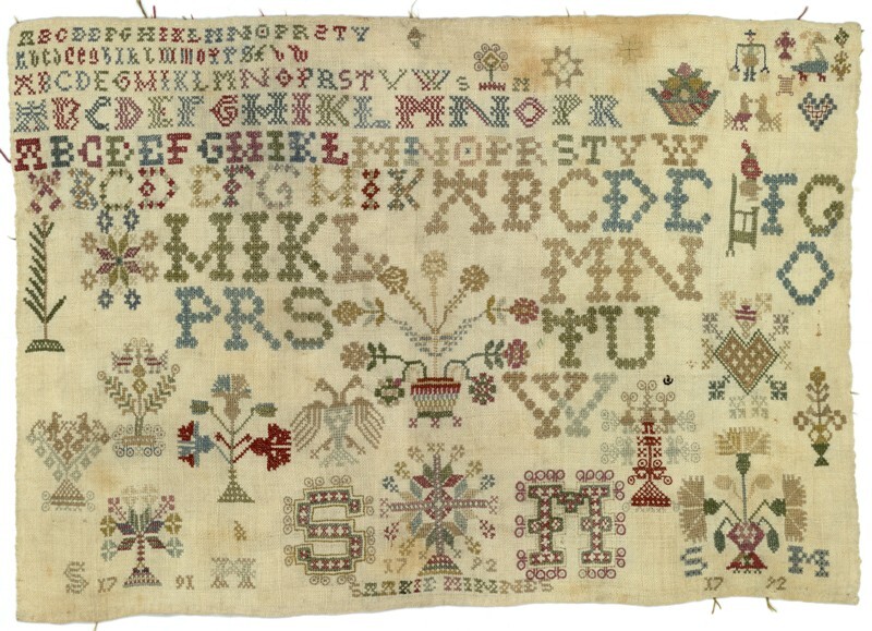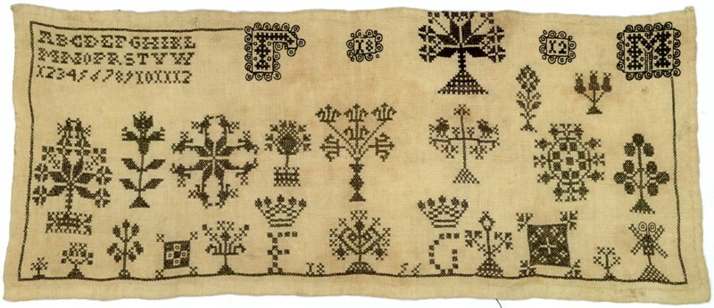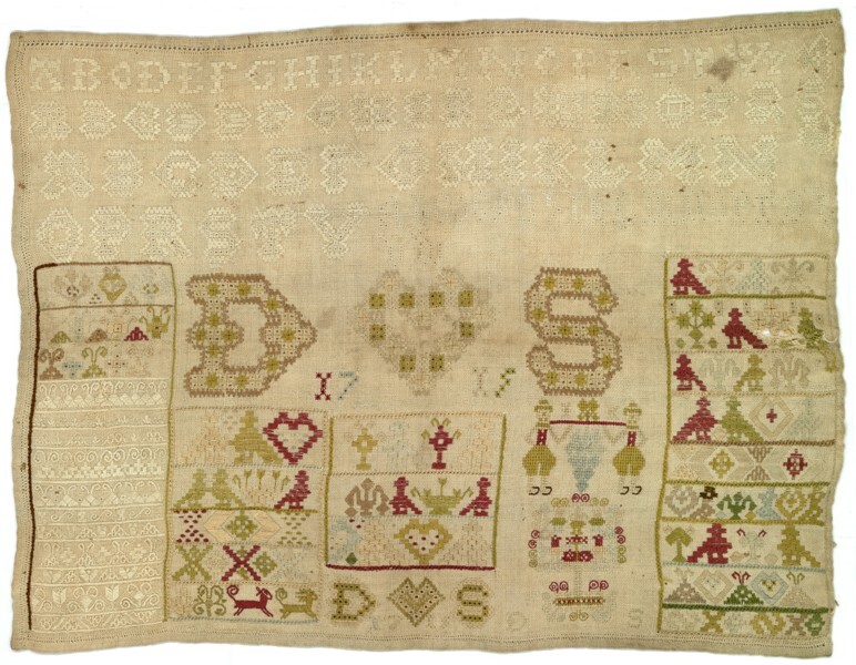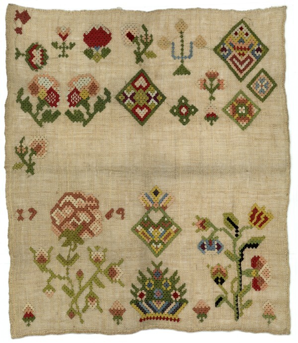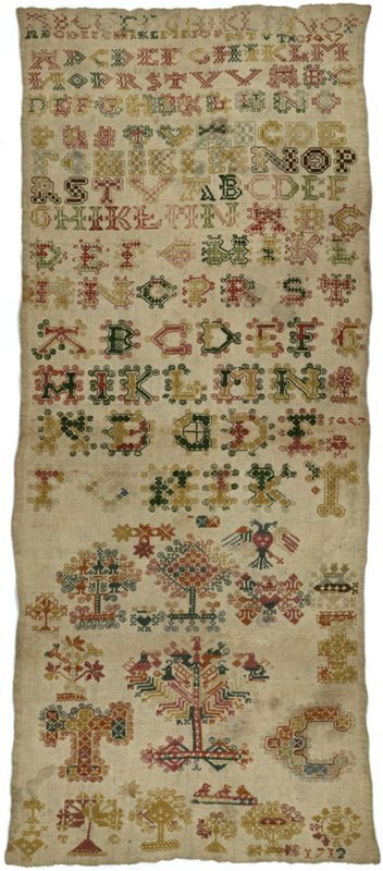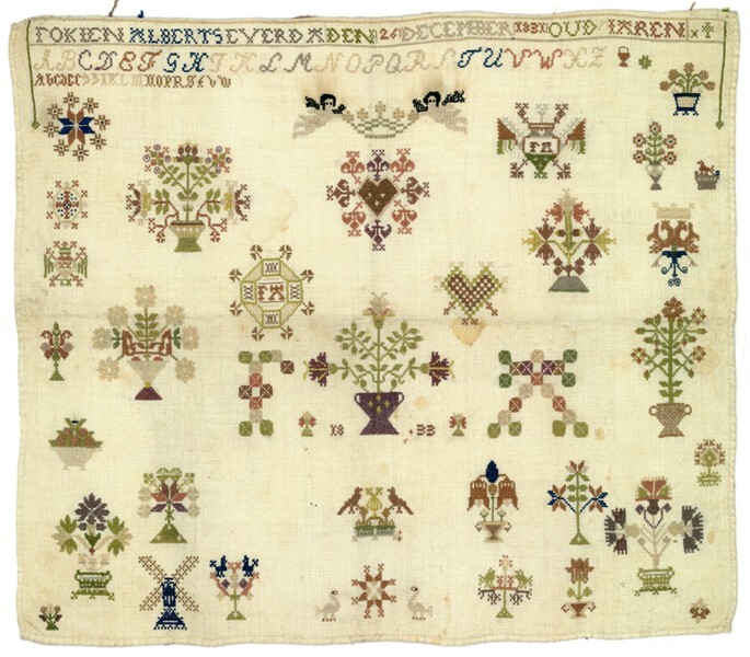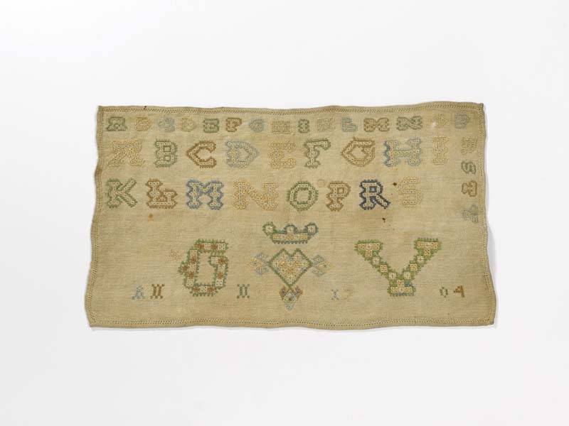 Merklap geborduurd met wol, gemerkt MGDA 1683
