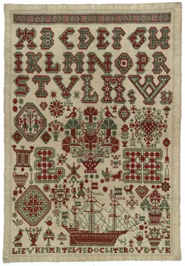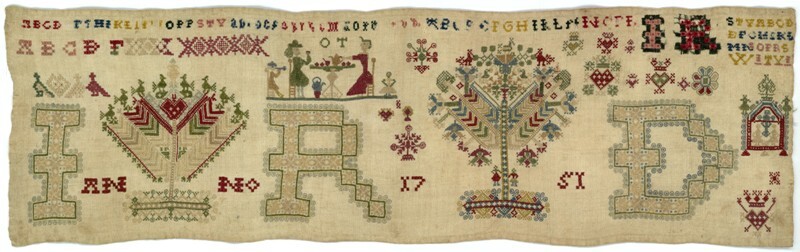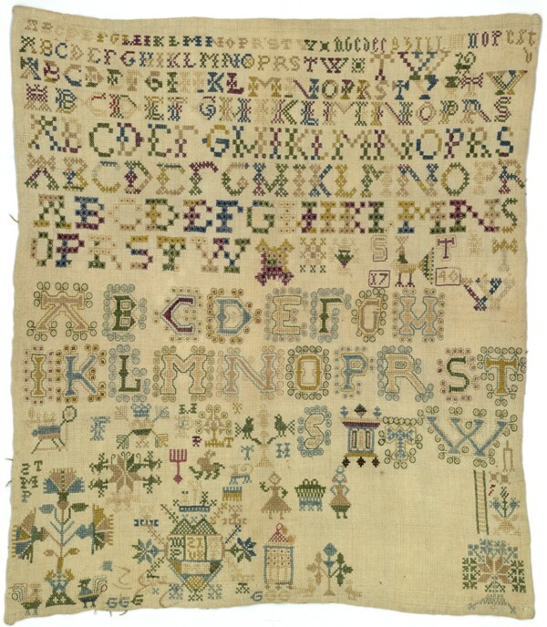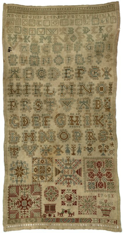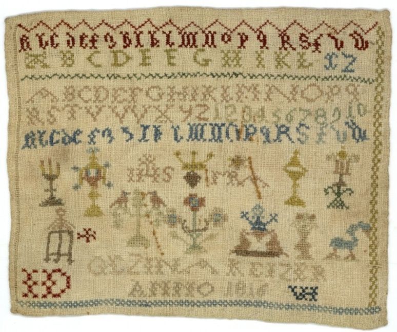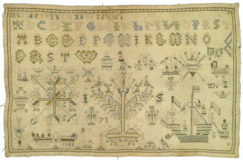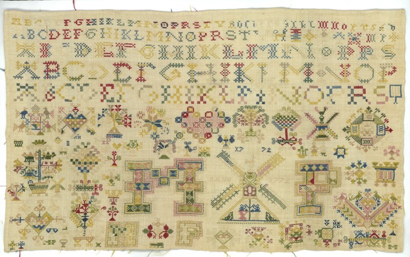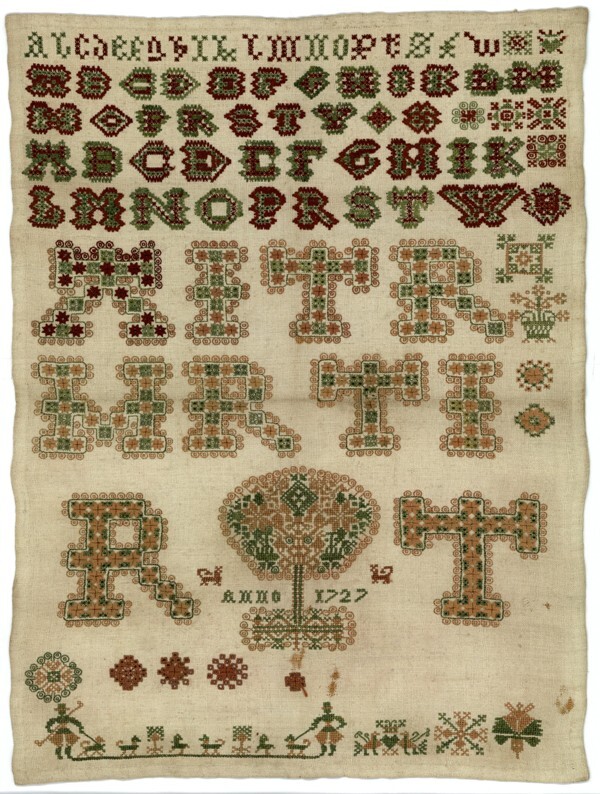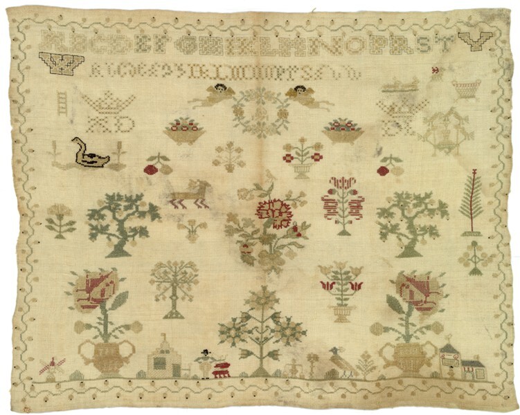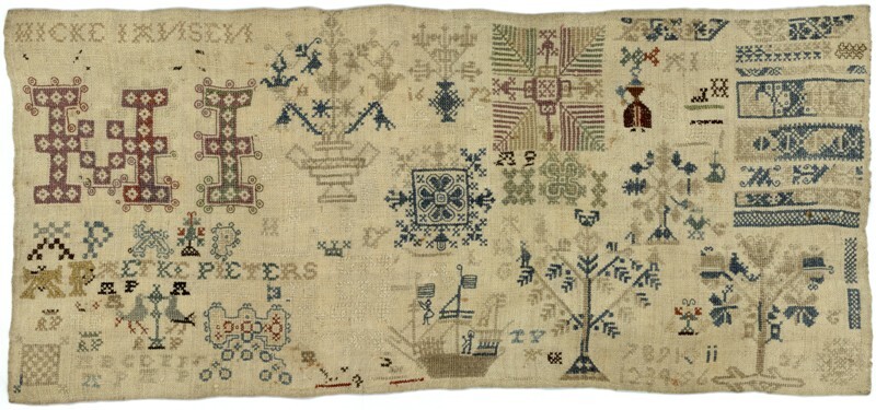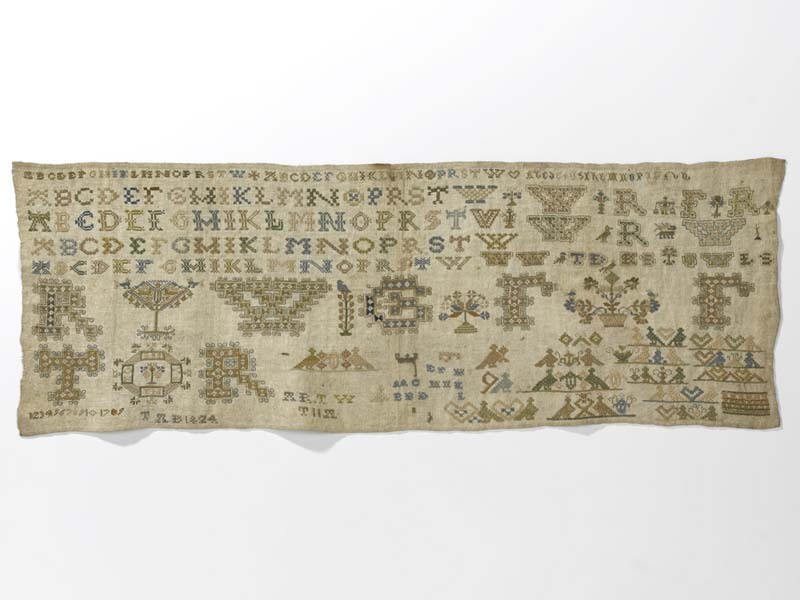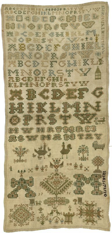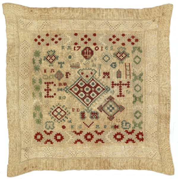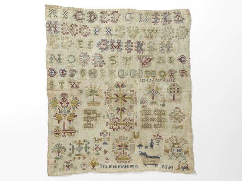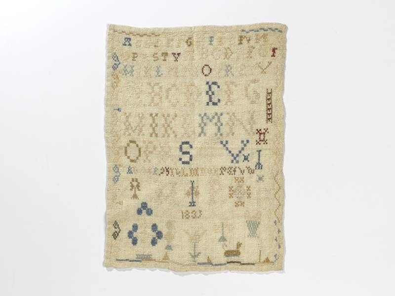 Merklap geborduurd met wol, gemerkt MGDA 1683