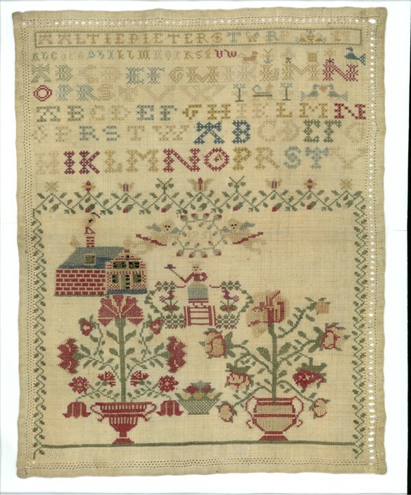 Merklap met grote bloemvazen en huis, gemerkt Aaltje...