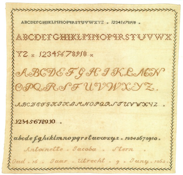Lettermerklap van linnen, geborduurd met zijden gare...