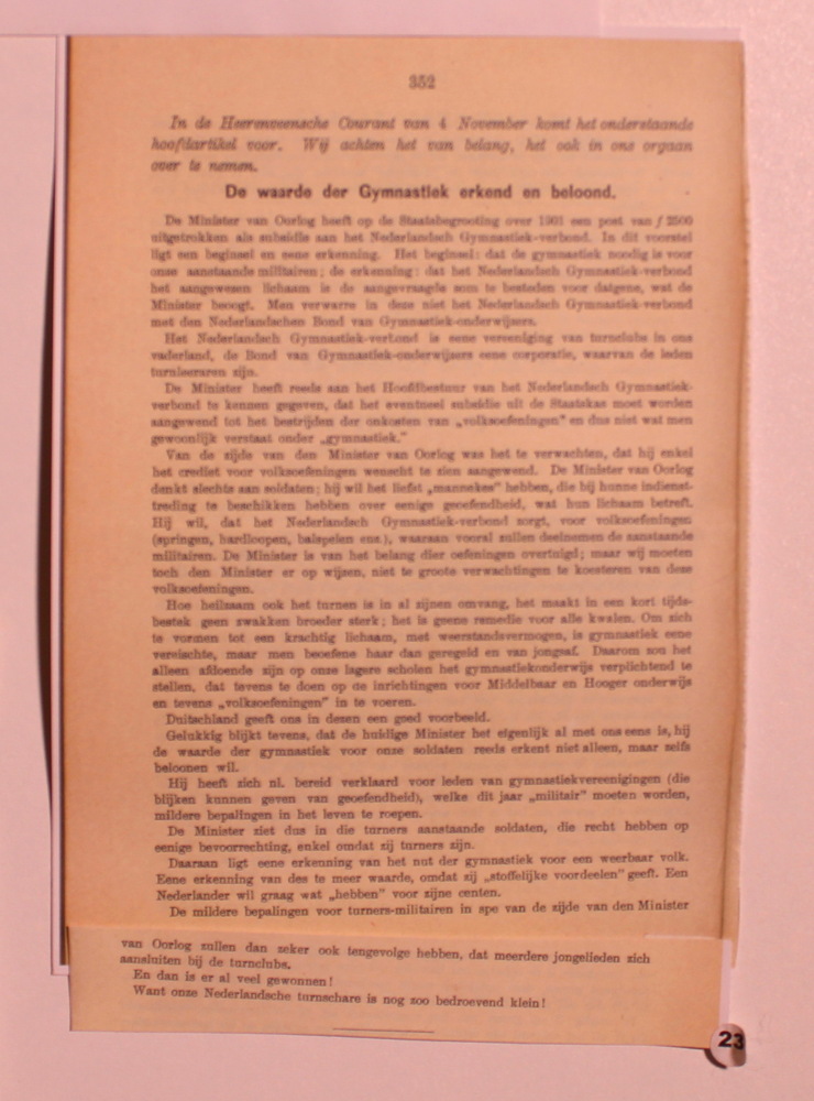 Artikel "De waarde der Gymnastiek erkend en beloond....