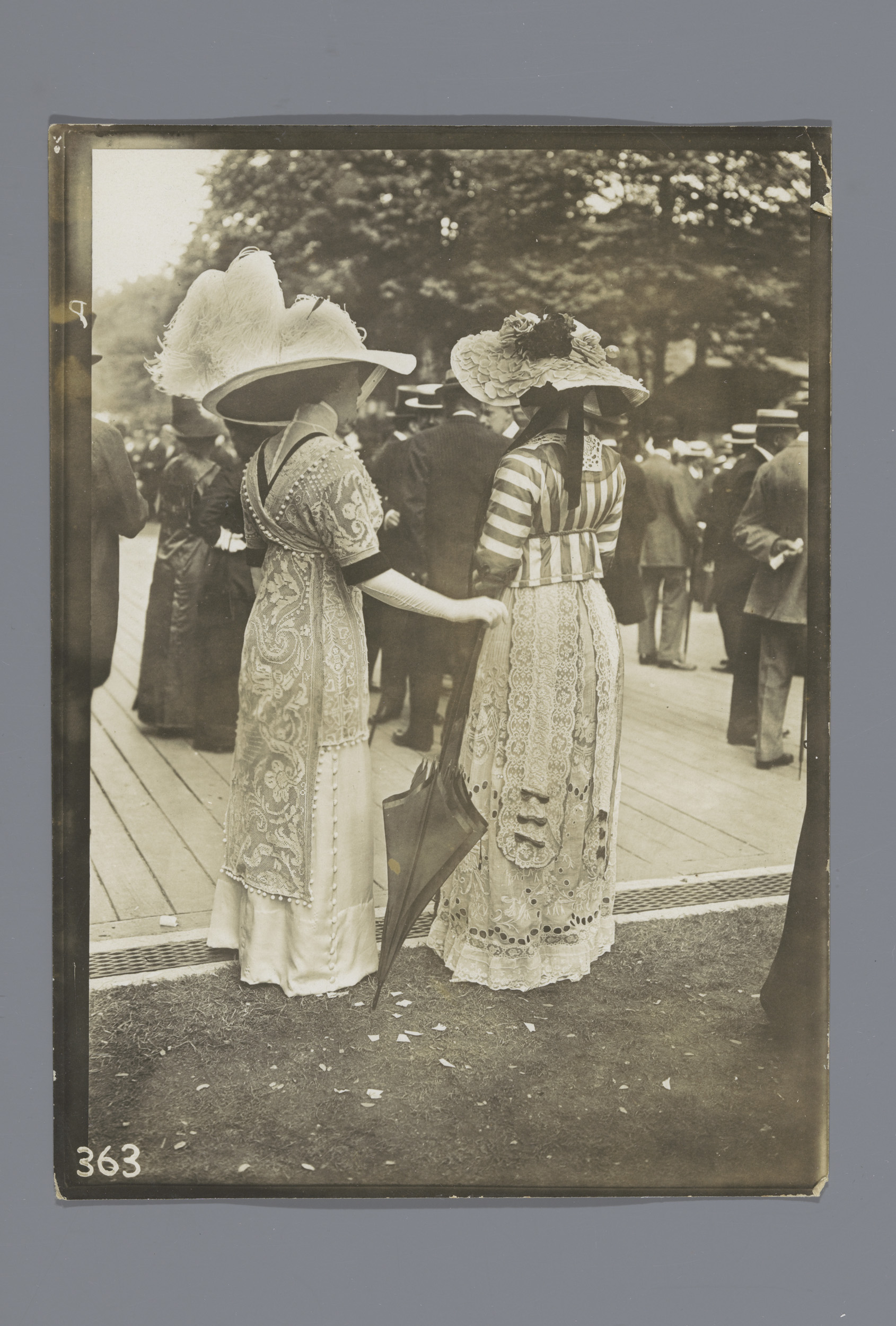 Twee vrouwen in een park of op een renbaan in Frankrijk
