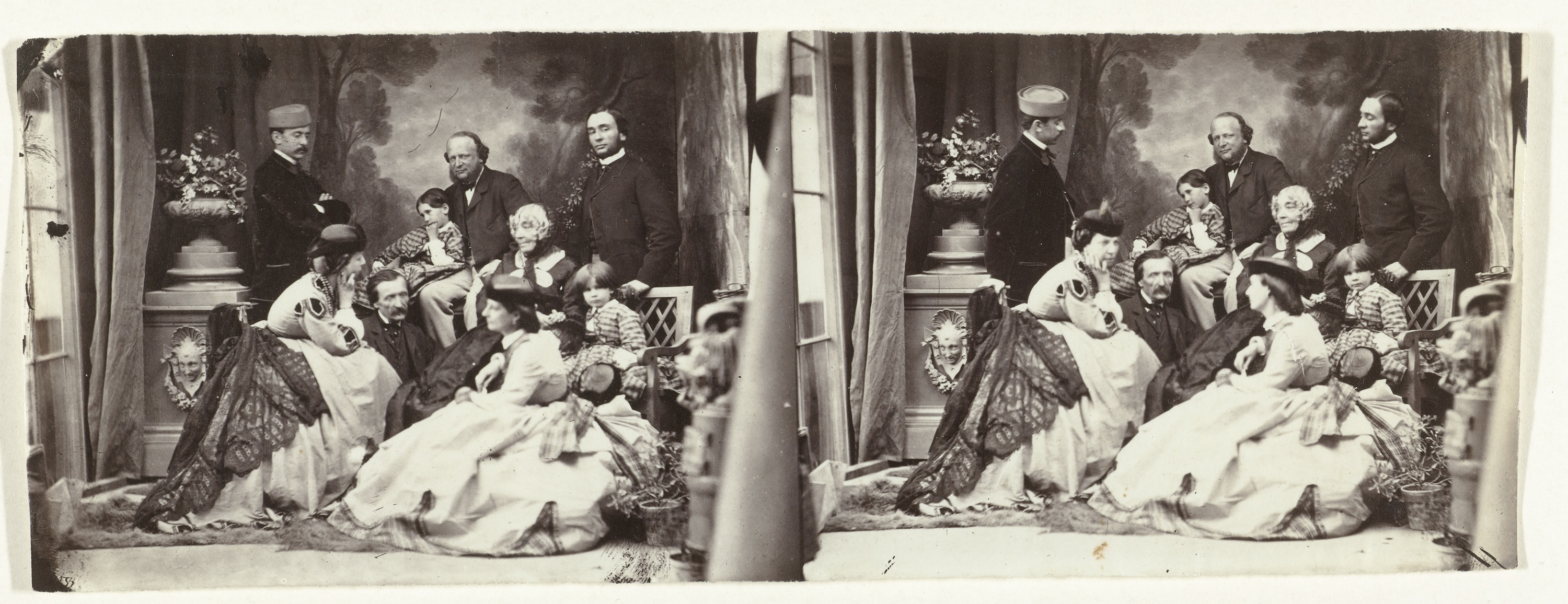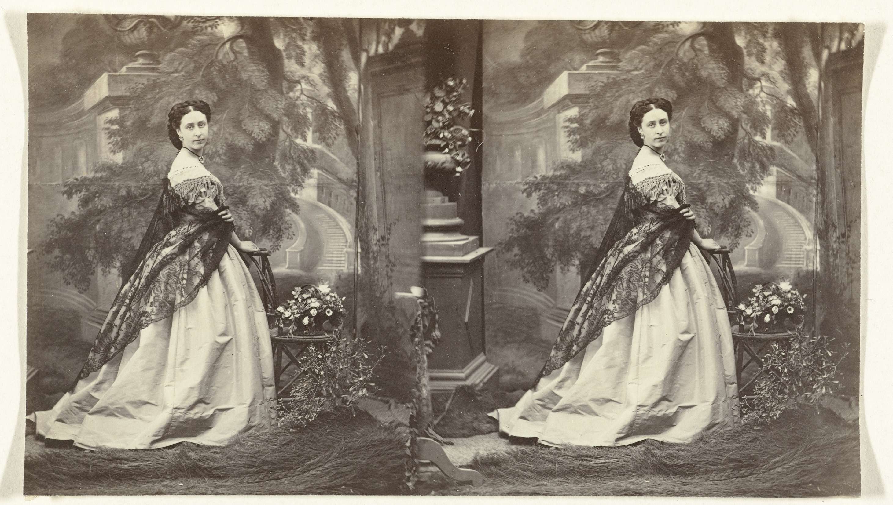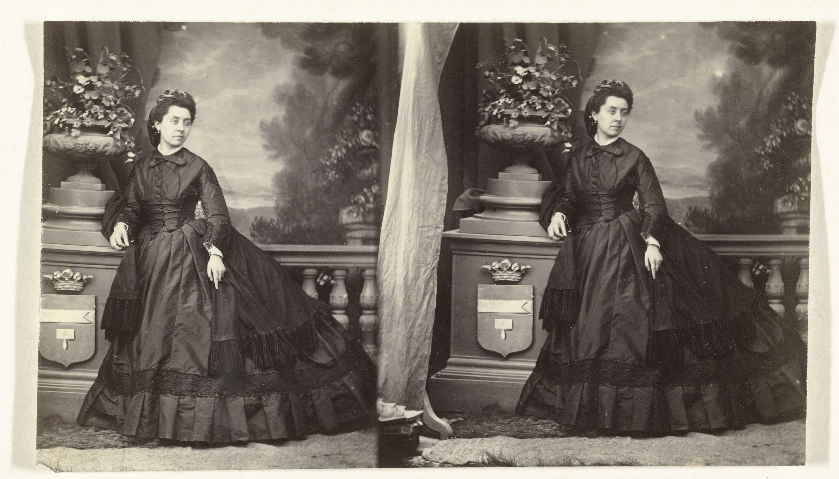 Vrouw met veer op haar hoed tussen enkele mannen, mo...