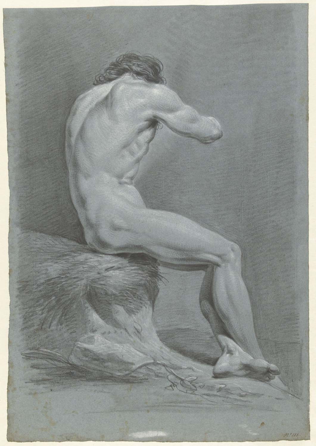 Zittend mannelijk naakt, op de rug gezien