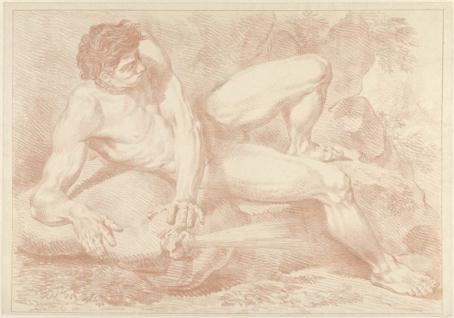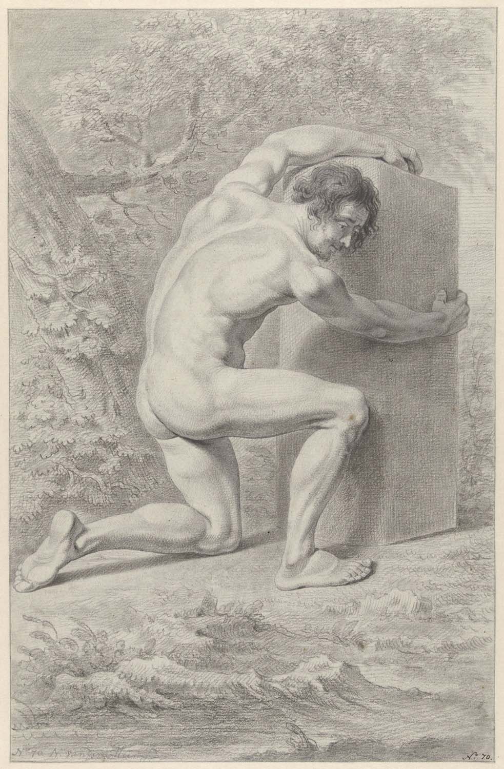 Zittend mannelijk naakt, geleund tegen een steen, va...